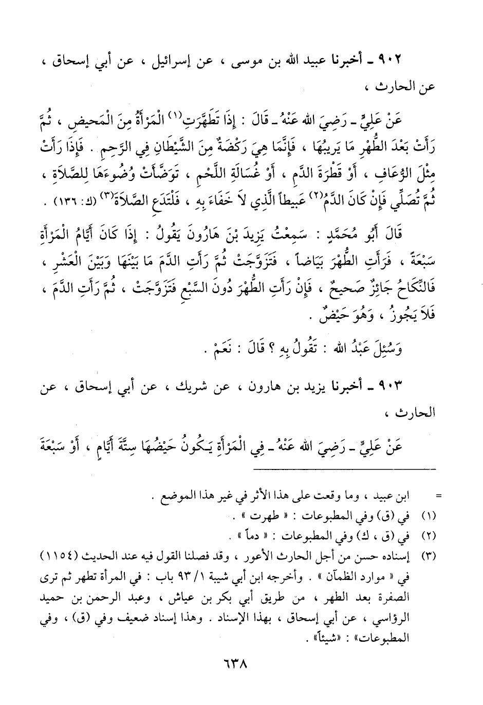 903 - أَخْبَرَنَا يَزِيدُ بْنُ هَارُونَ، عَنْ شَرِيكٍ، عَنْ أَبِي إِسْحَاقَ، عَنِ الْحَارِثِ، عَنْ عَلِيٍّ رَضِيَ اللَّهُ عَنْهُ، فِي «الْمَرْأَةِ يَكُونُ §حَيْضُهَا سِتَّةَ أَيَّامٍ، أَوْ سَبْعَةَ -[639]- أَيَّامٍ، ثُمَّ تَرَى كُدْرَةً، أَوْ صُفْرَةً، أَوْ تَرَى الْقَطْرَةَ، أَوِ الْقَطْرَتَيْنِ مِنَ الدَّمِ، أَنَّ ذَلِكَ بَاطِلٌ وَلَا يَضُرُّهَا شَيْءٌ» Qإسناده ضعيف شريك متأخر السماع من أبي إسحاق