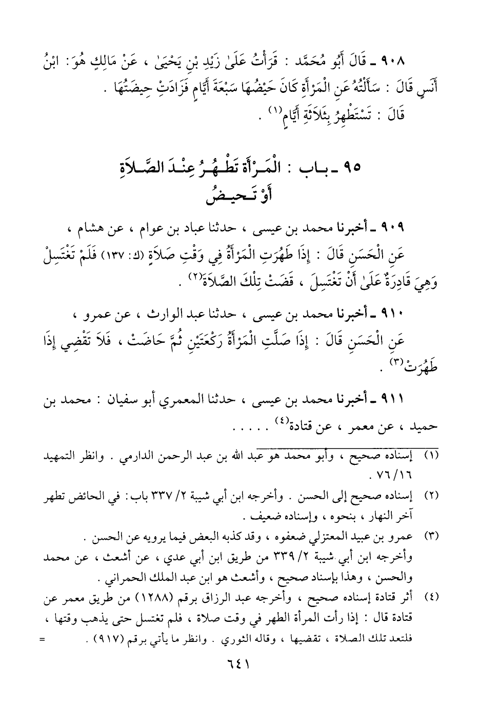 908 - قَالَ أَبُو مُحَمَّدٍ: قَرَأْتُ عَلَى زَيْدِ بْنِ يَحْيَى، عَنْ مَالِكٍ هُوَ ابْنُ أَنَسٍ، قَالَ: سَأَلْتُهُ عَنِ الْمَرْأَةِ كَانَ حَيْضُهَا سَبْعَةَ أَيَّامٍ فَزَادَتْ حَيْضَتُهَا. قَالَ: «§تَسْتَظْهِرُ بِثَلَاثَةِ أَيَّامٍ»