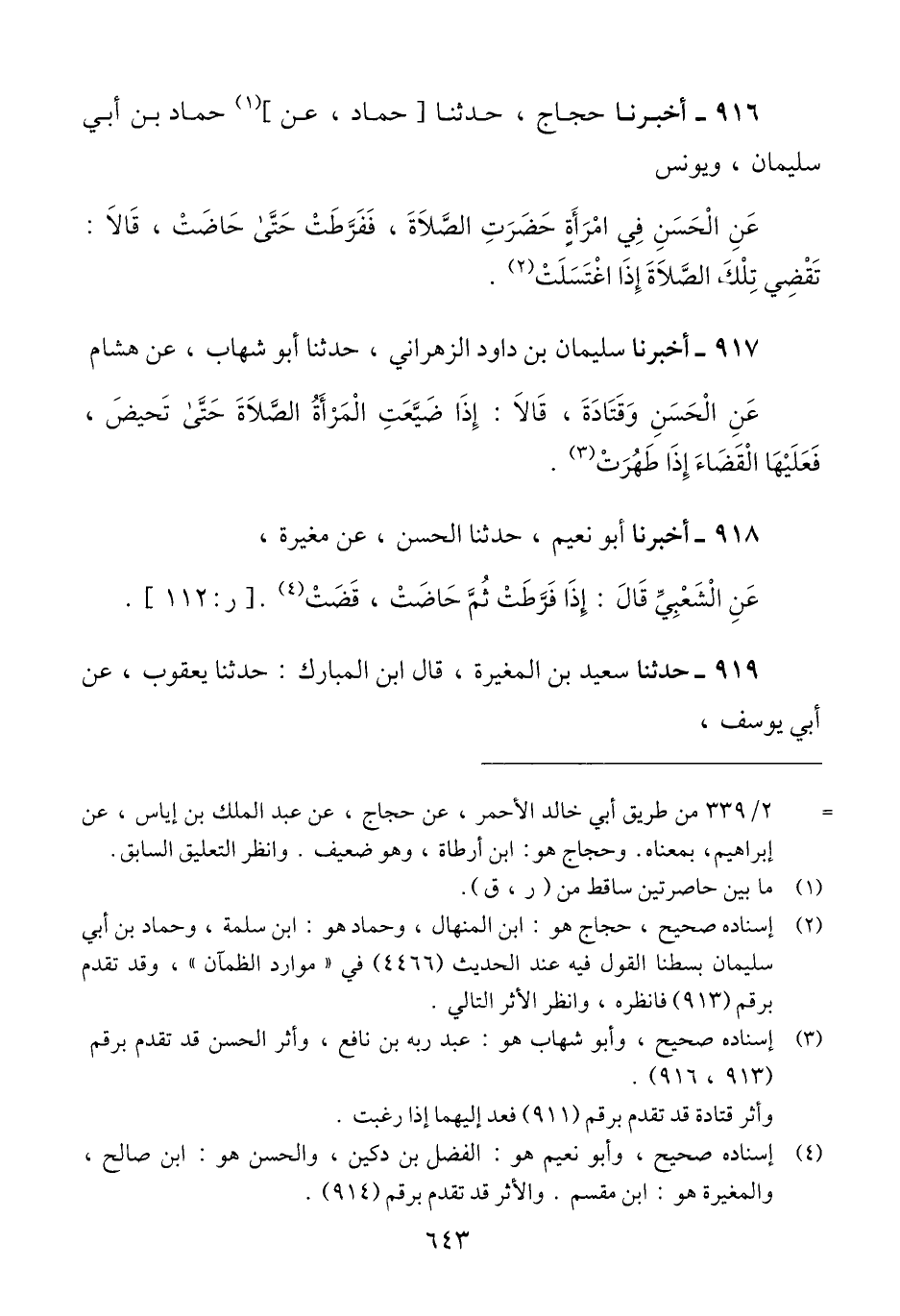 919 - حَدَّثَنَا سَعِيدُ بْنُ الْمُغِيرَةِ، قَالَ ابْنُ الْمُبَارَكِ، حَدَّثَنَا: يَعْقُوبُ، عَنْ أَبِي يُوسُفَ، -[644]- عَنْ سَعِيدِ بْنِ جُبَيْرٍ، قَالَ: «§إِذَا حَاضَتِ الْمَرْأَةُ فِي وَقْتِ الصَّلَاةِ، فَلَيْسَ عَلَيْهَا الْقَضَاءُ» قَالَ أَبُو مُحَمَّدٍ: «يَعْقُوبُ هُوَ ابْنُ الْقَعْقَاعِ قَاضِي مَرْوٍ، وَأَبُو يُوسُفَ شَيْخٌ مَكِّيٌّ» Qإسناده جيد