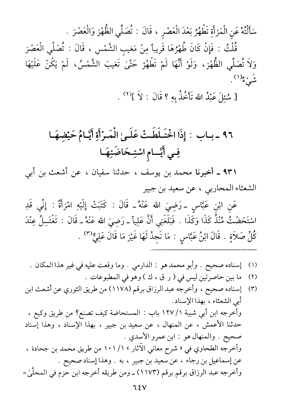 931 - أَخْبَرَنَا مُحَمَّدُ بْنُ يُوسُفَ، حَدَّثَنَا سُفْيَانُ، عَنْ أَشْعَثَ بْنِ أَبِي الشَّعْثَاءِ الْمُحَارِبِيِّ، عَنْ سَعِيدِ بْنِ جُبَيْرٍ، عَنِ ابْنِ عَبَّاسٍ رَضِيَ اللَّهُ عَنْهُ، قَالَ: كَتَبَتْ إِلَيْهِ امْرَأَةٌ: إِنِّي قَدِ اسْتُحِضْتُ مُنْذُ كَذَا وَكَذَا. فَبَلَغَنِي أَنَّ عَلِيًّا رَضِيَ اللَّهُ عَنْهُ، قَالَ: «§تَغْتَسِلُ عِنْدَ كُلِّ صَلَاةٍ» قَالَ ابْنُ عَبَّاسٍ: مَا نَجِدُ لَهَا غَيْرَ مَا قَالَ عَلِيٌّQإسناده صحيح