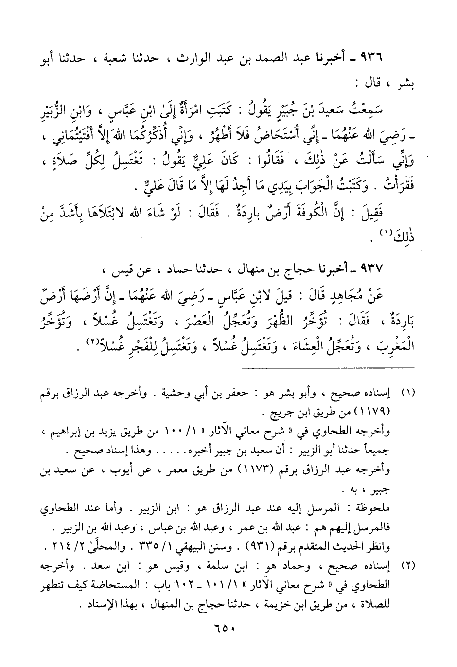 937 - أخْبرنا حجَّاجُ بْنُ مِنْهالٍ، حَدَّثَنَا حمَّادٌ، عنْ قيْسٍ، عنْ مُجاهدٍ، قَالَ: قِيلَ لِابْنِ عبَّاسٍ رَضِيَ اللَّهُ عَنْهُمَا، إِنَّ أرْضها أرْضٌ باردةٌ، فقالَ: «§تُؤخِّرُ الظُّهْرَ وتعجِّلُ العصْرَ، وتغْتسلُ غُسْلًا، وتؤخِّرُ المغْربَ، وتعجِّلُ العشاءَ، وتغْتسلُ غُسْلًا، وتغْتسلُ لِلفجْرِ غُسْلًا» Qإسناده صحيح
