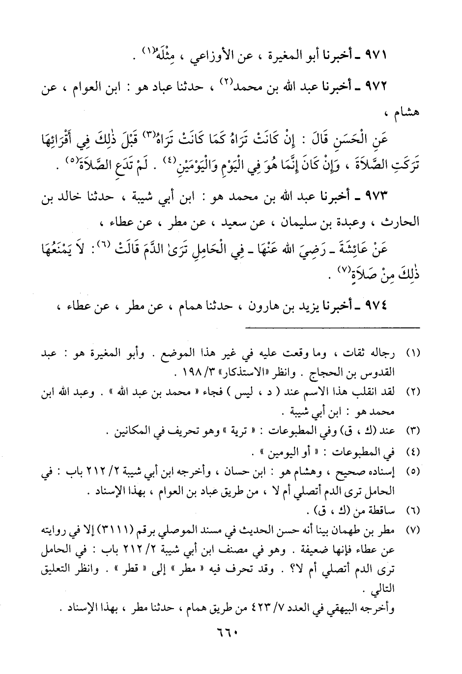 973 - أَخْبَرَنَا عَبْدُ اللَّهِ بْنُ مُحَمَّدٍ هُوَ ابْنُ أَبِي شَيْبَةَ، حَدَّثَنَا خَالِدُ بْنُ الْحَارِثِ، وَعَبْدَةُ بْنُ سُلَيْمَانَ، عَنْ سَعِيدٍ، عَنْ مَطَرٍ، عَنْ عَطَاءٍ، عَنْ عَائِشَةَ رَضِيَ اللَّهُ عَنْهَا، فِي §الْحَامِلِ تَرَى الدَّمَ، قَالَتْ: «لَا يَمْنَعُهَا ذَلِكَ مِنْ صَلَاةٍ» Qلم يحكم عليه المحقق