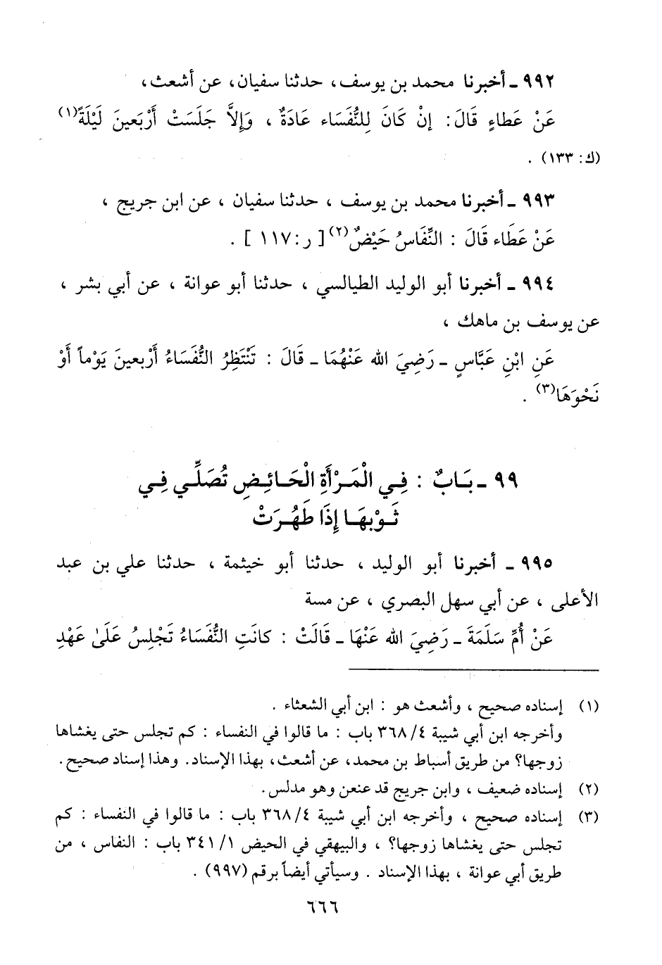 993 - أَخْبَرَنَا مُحَمَّدُ بْنُ يُوسُفَ، حَدَّثَنَا سُفْيَانُ، عَنِ ابْنِ جُرَيْجٍ، عَنْ عَطَاءٍ، قَالَ: «§النِّفَاسُ حَيْضٌ» Qإسناده ضعيف وابن جريج قد عنعن وهو مدلس