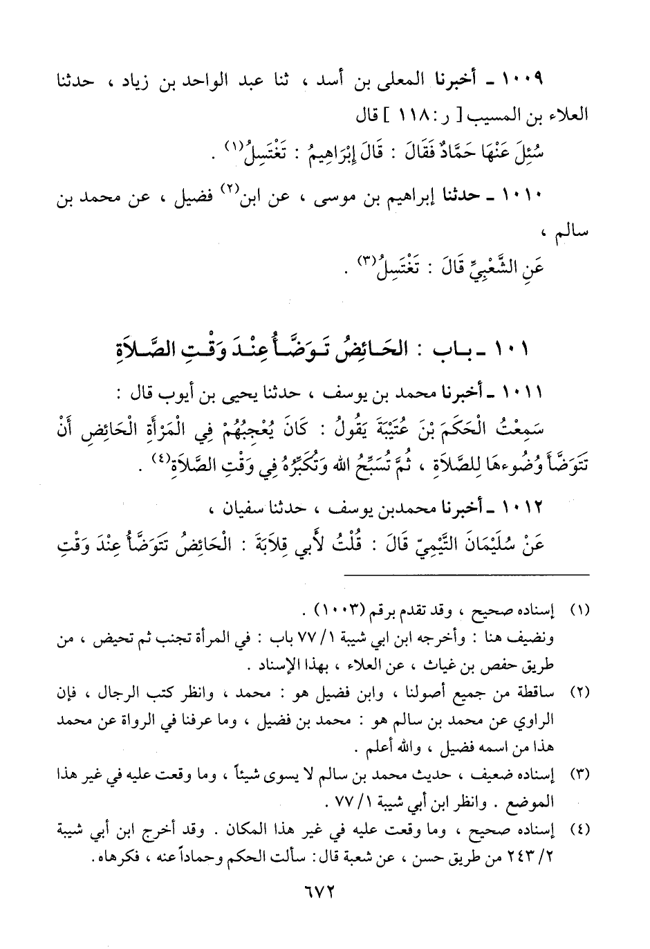 1011 - أَخْبَرَنَا مُحَمَّدُ بْنُ يُوسُفَ، حَدَّثَنَا يَحْيَى بْنُ أَيُّوبَ، قَالَ: سَمِعْتُ الْحَكَمَ بْنَ عُتَيْبَةَ، يَقُولُ: «كَانَ يُعْجِبُهُمْ فِي الْمَرْأَةِ §الْحَائِضِ أَنْ تتَوَضَّأَ وُضُوءَهَا لِلصَّلَاةِ، ثُمَّ تُسَبِّحَ اللَّهَ وَتُكَبِّرَهُ فِي وَقْتِ الصَّلَاةِ» Qإسناده صحيح