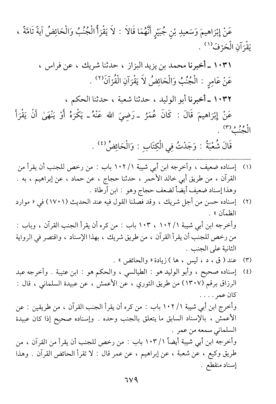 1032 - أَخْبَرَنَا أَبُو الْوَلِيدِ حَدَّثَنَا شُعْبَةُ، حَدَّثَنَا الْحَكَمُ، عَنْ إِبْرَاهِيمَ، قَالَ: كَانَ عُمَرُ رَضِيَ اللَّهُ عَنْهُ، «يَكْرَهُ أَوْ §يَنْهَى أَنْ يَقْرَأَ الْجُنُبُ» قَالَ شُعْبَةُ: وَجَدْتُ فِي الْكِتَابِ: وَالْحَائِضُQإسناده صحيح