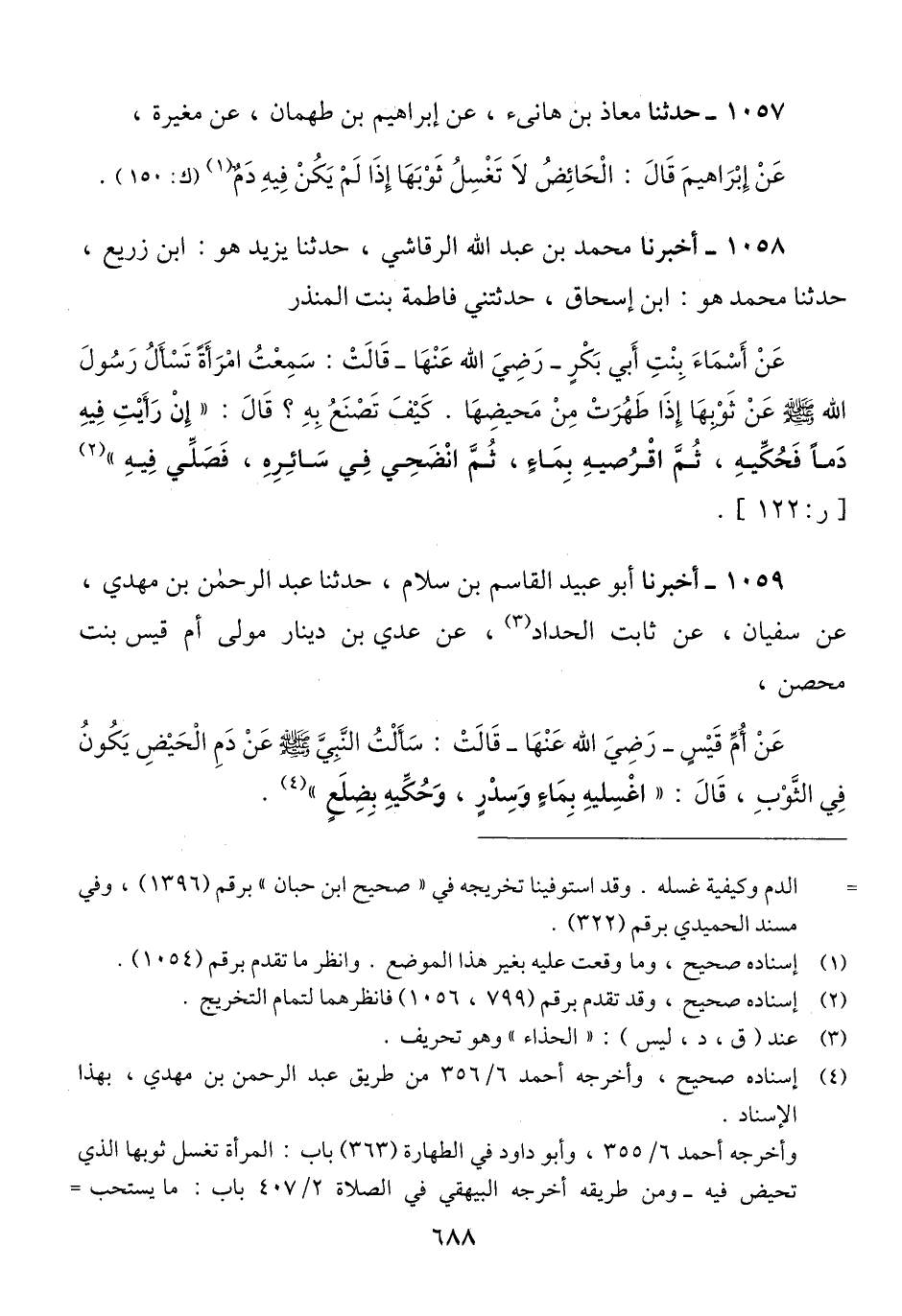 1057 - حَدَّثَنَا مُعَاذُ بْنُ هَانِئٍ، عَنْ إِبْرَاهِيمَ بْنِ طَهْمَانَ، عَنْ مُغِيرَةَ، عَنْ إِبْرَاهِيمَ، قَالَ: «§الْحَائِضُ لَا تَغْسِلُ ثَوْبَهَا، إِذَا لَمْ يَكُنْ فِيهِ دَمٌ» Qإسناده صحيح