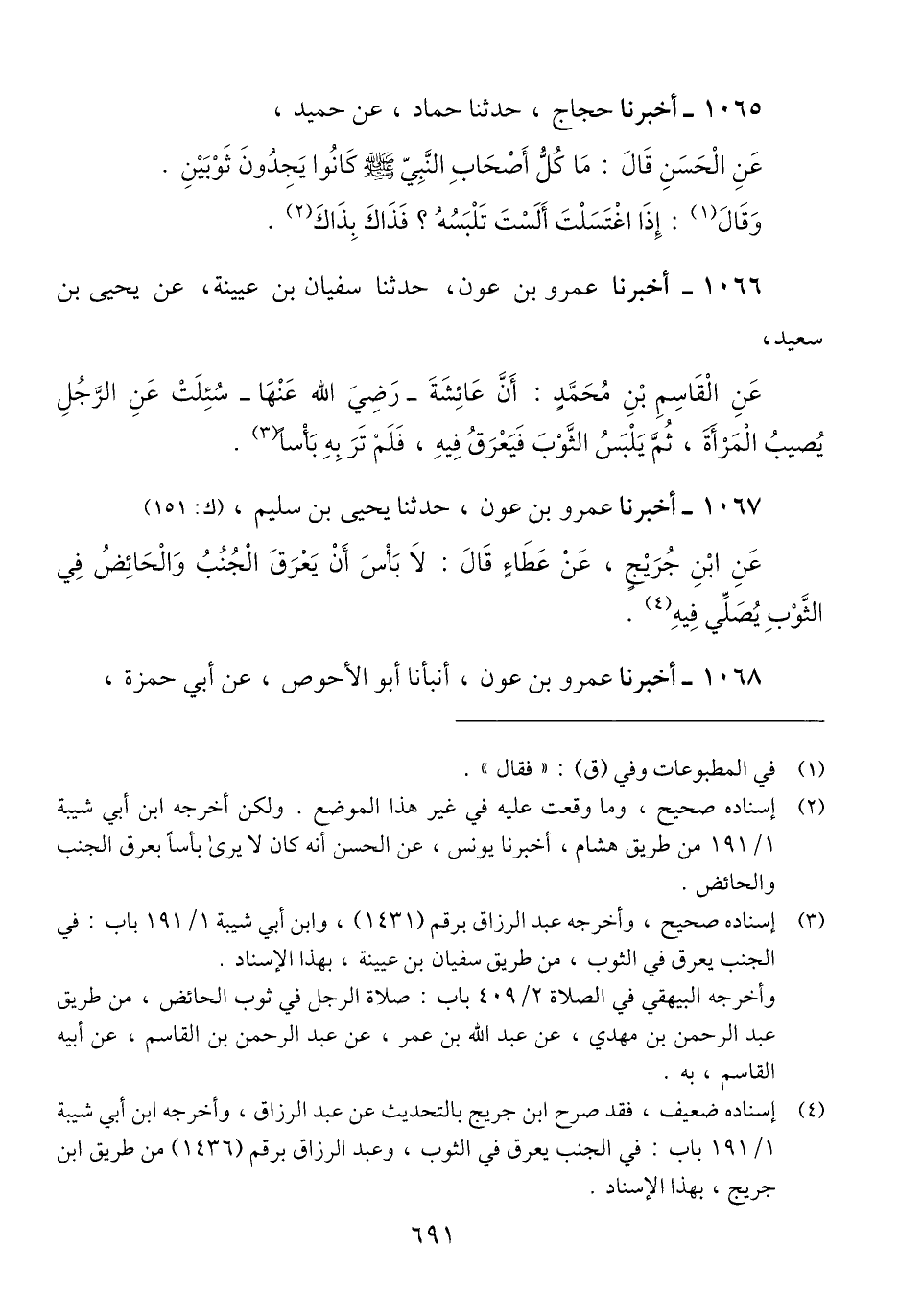 1067 - أَخْبَرَنَا عَمْرُو بْنُ عَوْنٍ، حَدَّثَنَا يَحْيَى بْنُ سُلَيْمٍ، عَنِ ابْنِ جُرَيْجٍ، عَنْ عَطَاءٍ، قَالَ: «§لَا بَأْسَ أَنْ يَعْرَقَ الْجُنُبُ وَالْحَائِضُ فِي الثَّوْبِ، يُصَلَّى فِيهِ» Qإسناده ضعيف فقد صرح ابن جريج بالتحديث عن عبد الرازق