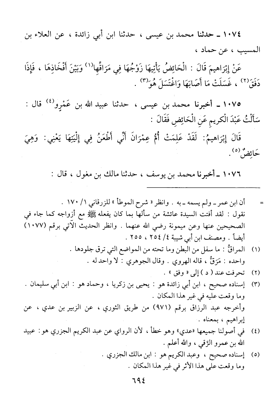 1074 - حَدَّثَنَا مُحَمَّدُ بْنُ عِيسَى، حَدَّثَنَا ابْنُ أَبِي زَائِدَةَ، عَنِ الْعَلَاءِ بْنِ الْمُسَيَّبِ، عَنْ حَمَّادٍ، عَنْ إِبْرَاهِيمَ، قَالَ: «§الْحَائِضُ يَأْتِيهَا زَوْجُهَا فِي مَرَاقِّهَا وَبَيْنَ فَخِذَيْهَا، فَإِذَا دَفَقَ، غَسَلَتْ مَا أَصَابَهَا وَاغْتَسَلَ هُوَ» Qإسناده صحيح