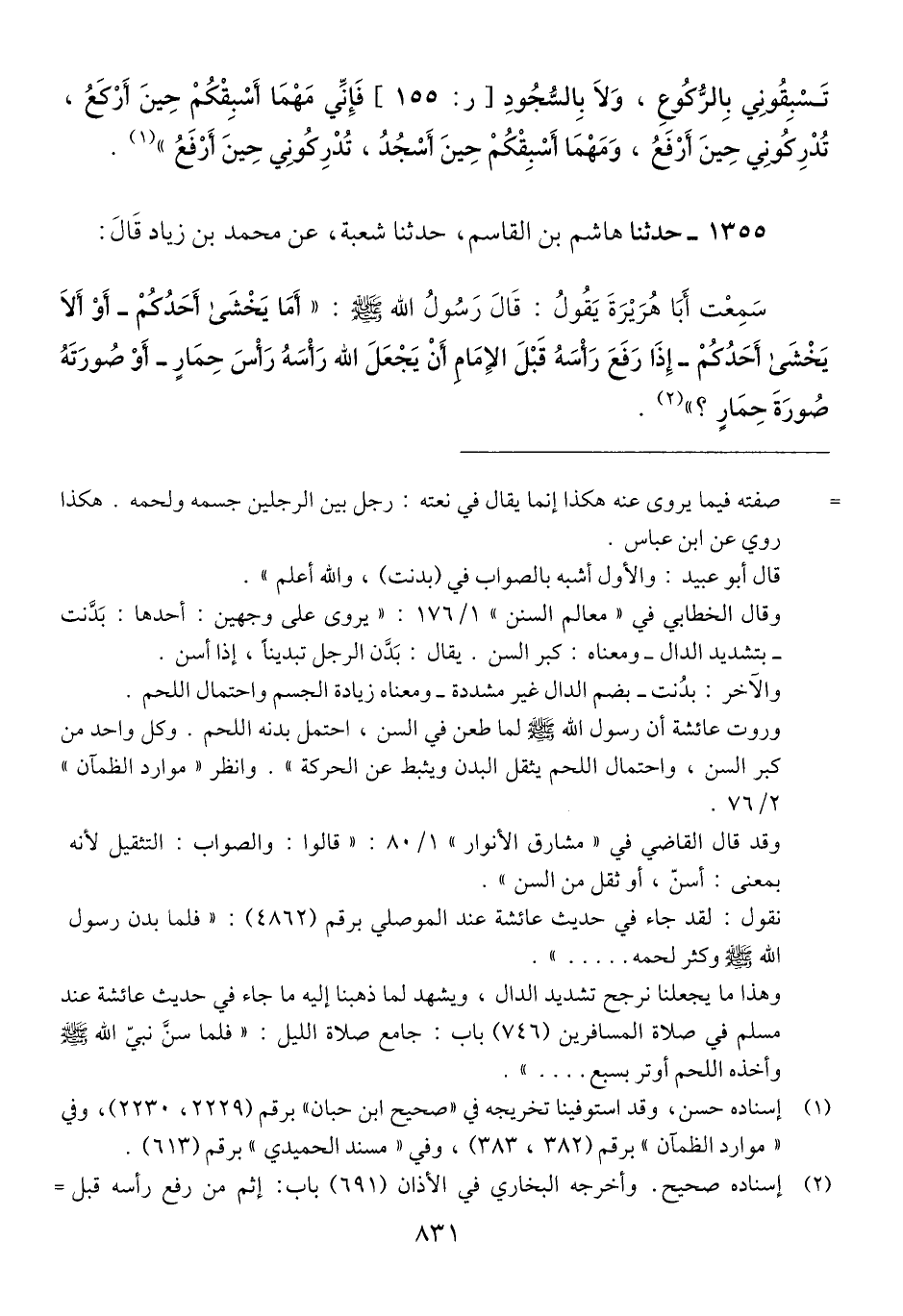 1355 - حَدَّثَنَا هَاشِمُ بْنُ الْقَاسِمِ، حَدَّثَنَا شُعْبَةُ، عَنْ مُحَمَّدِ بْنِ زِيَادٍ، قَالَ: سَمِعْتُ أَبَا هُرَيْرَةَ، يَقُولُ: قَالَ رَسُولُ اللَّهِ صَلَّى اللهُ عَلَيْهِ وَسَلَّمَ: «§أَمَا يَخْشَى أَحَدُكُمْ - أَوْ أَلَا يَخْشَى أَحَدُكُمْ - إِذَا رَفَعَ رَأْسَهُ قَبْلَ الْإِمَامِ، أَنْ يَجْعَلَ اللَّهُ رَأْسَهُ رَأْسَ حِمَارٍ - أَوْ صُورَتَهُ صُورَةَ حِمَارٍ؟ -» Qإسناده صحيح