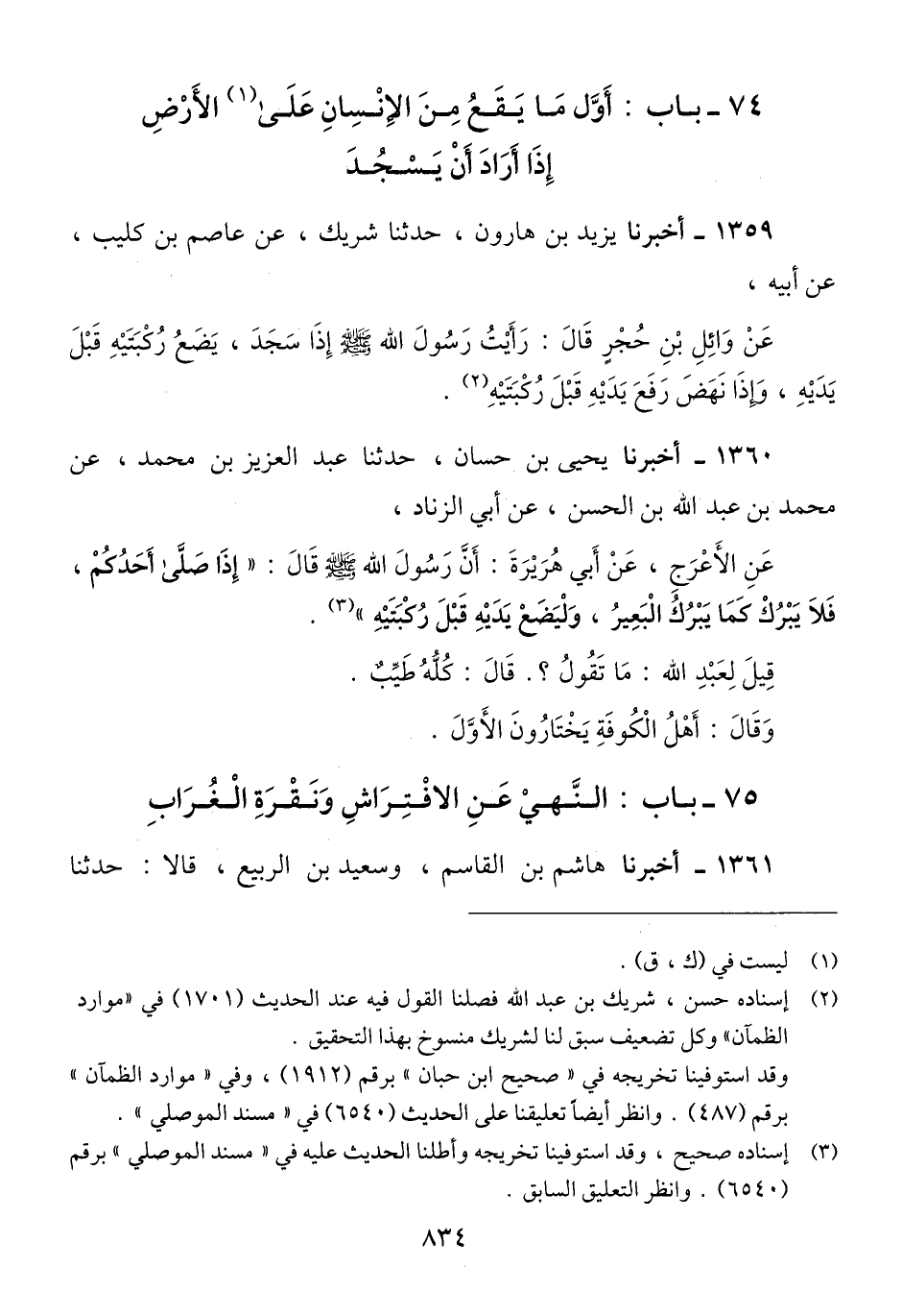 1359 - أَخْبَرَنَا يَزِيدُ بْنُ هَارُونَ، حَدَّثَنَا شَرِيكٌ، عَنْ عَاصِمِ بْنِ كُلَيْبٍ، عَنْ أَبِيهِ، عَنْ وَائِلِ بْنِ حُجْرٍ، قَالَ: رَأَيْتُ رَسُولَ اللَّهِ صَلَّى اللهُ عَلَيْهِ وَسَلَّمَ: «§إِذَا سَجَدَ، يَضَعُ رُكْبَتَيْهِ قَبْلَ يَدَيْهِ، وَإِذَا نَهَضَ رَفَعَ يَدَيْهِ قَبْلَ رُكْبَتَيْهِ» Qإسناده حسن