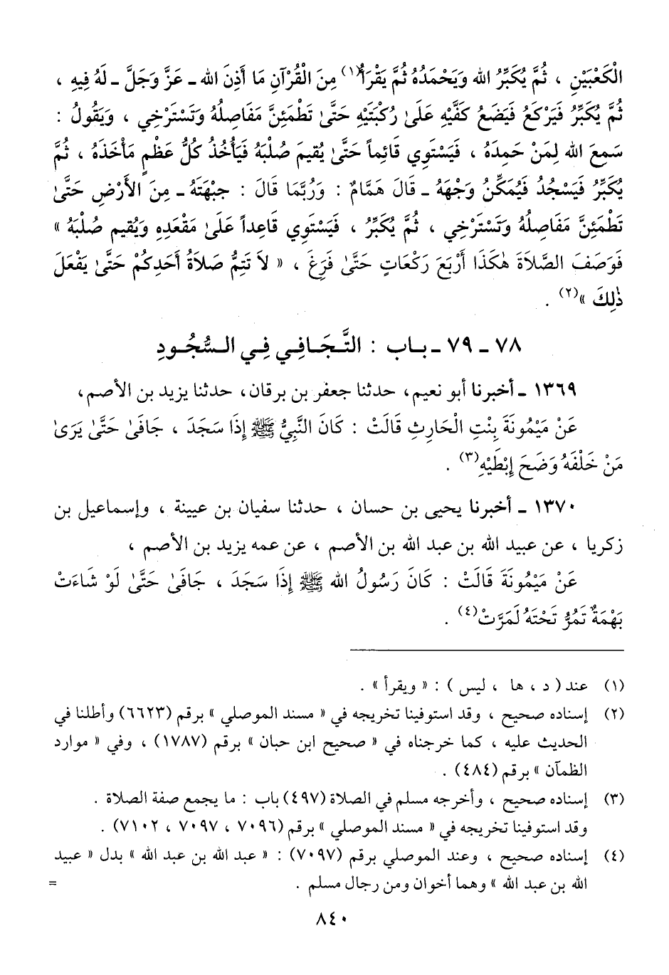 1370 - أَخْبَرَنَا يَحْيَى بْنُ حَسَّانَ، حَدَّثَنَا سُفْيَانُ بْنُ عُيَيْنَةَ، وَإِسْمَاعِيلُ بْنُ زَكَرِيَّا، عَنْ عُبَيْدِ اللَّهِ بْنِ عَبْدِ اللَّهِ بْنِ الْأَصَمِّ، عَنْ عَمِّهِ يَزِيدَ بْنِ الْأَصَمِّ، عَنْ مَيْمُونَةَ، قَالَتْ: كَانَ رَسُولُ اللَّهِ صَلَّى اللهُ عَلَيْهِ وَسَلَّمَ «§إِذَا سَجَدَ، جَافَى حَتَّى لَوْ شَاءَتْ بَهْمَةٌ تَمُرُّ تَحْتَهُ لَمَرَّتْ» Qإسناده صحيح