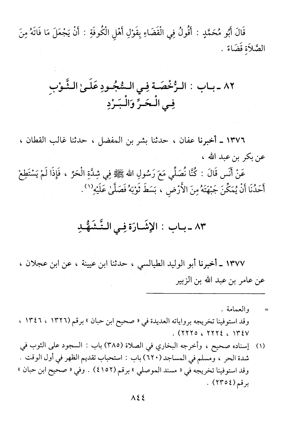 1376 - أَخْبَرَنَا عَفَّانُ، حَدَّثَنَا بِشْرُ بْنُ الْمُفَضَّلِ، حَدَّثَنَا غَالِبٌ الْقَطَّانُ، عَنْ بَكْرِ بْنِ عَبْدِ اللَّهِ، عَنْ أَنَسٍ، قَالَ «كُنَّا نُصَلِّي مَعَ رَسُولِ اللَّهِ صَلَّى اللهُ عَلَيْهِ وَسَلَّمَ §فِي شِدَّةِ الْحَرِّ فَإِذَا لَمْ يَسْتَطِعْ أَحَدُنَا أَنْ يُمَكِّنَ جَبْهَتَهُ مِنَ الْأَرْضِ، بَسَطَ ثَوْبَهُ فَصَلَّى عَلَيْهِ» Qإسناده صحيح