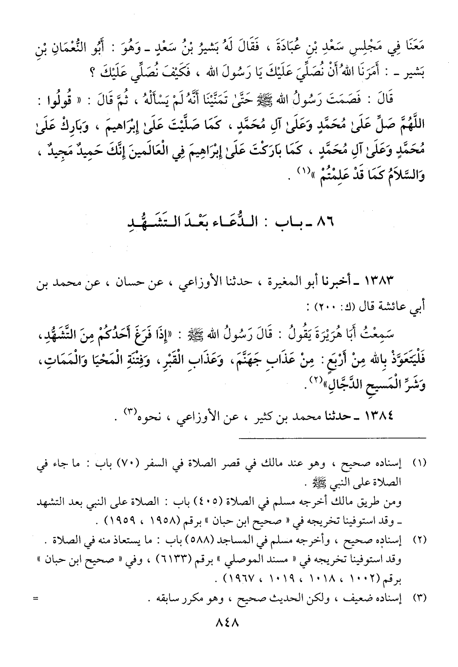 1383 - أَخْبَرَنَا أَبُو الْمُغِيرَةِ، حَدَّثَنَا الْأَوْزَاعِيُّ، عَنْ حَسَّانَ، عَنْ مُحَمَّدِ بْنِ أَبِي عَائِشَةَ، قَالَ: سَمِعْتُ أَبَا هُرَيْرَةَ، يَقُولُ: قَالَ رَسُولُ اللَّهِ صَلَّى اللهُ عَلَيْهِ وَسَلَّمَ: " §إِذَا فَرَغَ أَحَدُكُمْ مِنَ التَّشَهُّدِ، فَلْيَتَعَوَّذْ بِاللَّهِ مِنْ أَرْبَعٍ: مِنْ عَذَابِ جَهَنَّمَ، وَعَذَابِ الْقَبْرِ، وَفِتْنَةِ الْمَحْيَا وَالْمَمَاتِ، وَشَرِّ الْمَسِيحِ الدَّجَّالِ "