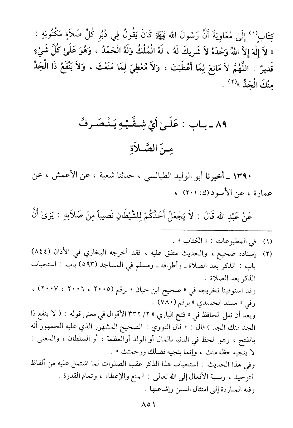 1390 - أَخْبَرَنَا أَبُو الْوَلِيدِ الطَّيَالِسِيُّ، حَدَّثَنَا شُعْبَةُ، عَنِ الْأَعْمَشِ، عَنْ عُمَارَةَ، عَنِ الْأَسْوَدِ، عَنْ عَبْدِ اللَّهِ، قَالَ: §لَا يَجْعَلْ أَحَدُكُمْ لِلشَّيْطَانِ نَصِيبًا مِنْ صَلَاتِهِ: يَرَى أَنَّ -[852]- حَقًّا عَلَيْهِ أَنْ لَا يَنْصَرِفَ إِلَّا عَنْ يَمِينِهِ. لَقَدْ «رَأَيْتُ رَسُولَ اللَّهِ صَلَّى اللهُ عَلَيْهِ وَسَلَّمَ كَثِيرًا يَنْصَرِفُ عَنْ يَسَارِهِ» Qإسناده صحيح