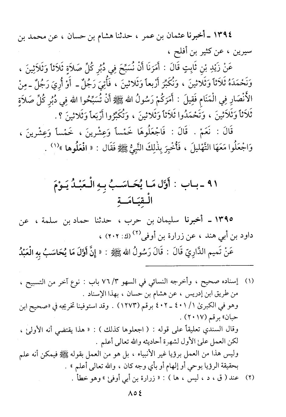1394 - أَخْبَرَنَا عُثْمَانُ بْنُ عُمَرَ، حَدَّثَنَا هِشَامُ بْنُ حَسَّانَ، عَنْ مُحَمَّدِ بْنِ سِيرِينَ، عَنْ كَثِيرِ بْنِ أَفْلَحَ، عَنْ زَيْدِ بْنِ ثَابِتٍ، قَالَ: أُمِرْنَا أَنْ نُسَبِّحَ فِي دُبُرِ كُلِّ صَلَاةٍ ثَلَاثًا وَثَلَاثِينَ، وَنَحْمَدَهُ ثَلَاثًا وَثَلَاثِينَ، وَنُكَبِّرَ أَرْبَعًا وَثَلَاثِينَ، فَأُتِيَ رَجُلٌ - أَوْ أُرِيَ رَجُلٌ - مِنَ الْأَنْصَارِ فِي الْمَنَامِ فَقِيلَ: «§أَمَرَكُمْ رَسُولُ اللَّهِ صَلَّى اللهُ عَلَيْهِ وَسَلَّمَ أَنْ تُسَبِّحُوا اللَّهَ فِي دُبُرِ كُلِّ صَلَاةٍ ثَلَاثًا وَثَلَاثِينَ، وَتَحْمَدُوا ثَلَاثًا وَثَلَاثِينَ، وَتُكَبِّرُوا أَرْبَعًا وَثَلَاثِينَ؟» قَالَ: نَعَمْ. قَالَ: فَاجْعَلُوهَا خَمْسًا وَعِشْرِينَ، خَمْسًا وَعِشْرِينَ، وَاجْعَلُوا مَعَهَا التَّهْلِيلَ، فَأُخْبِرَ بِذَلِكَ النَّبِيُّ صَلَّى اللهُ عَلَيْهِ وَسَلَّمَ فَقَالَ: «افْعَلُوهَا» Qإسناده صحيح