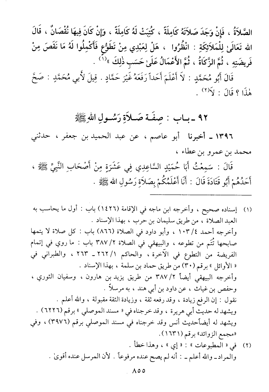 1396 - أَخْبَرَنَا أَبُو عَاصِمٍ، عَنْ عَبْدِ الْحَمِيدِ بْنِ جَعْفَرٍ، حَدَّثَنِي مُحَمَّدُ بْنُ عَمْرِو بْنِ عَطَاءٍ، قَالَ: سَمِعْتُ أَبَا حُمَيْدٍ السَّاعِدِيَّ، فِي عَشَرَةٍ مِنْ أَصْحَابِ النَّبِيِّ صَلَّى اللهُ عَلَيْهِ وَسَلَّمَ أَحَدُهُمْ أَبُو قَتَادَةَ، قَالَ: أَنَا أَعْلَمُكُمْ بِصَلَاةِ رَسُولِ اللَّهِ صَلَّى اللهُ عَلَيْهِ وَسَلَّمَ -[856]- فَقَالُوا: لِمَ؟ فَمَا كُنْتَ أَكْثَرَنَا لَهُ تَبَعَةً، وَلَا أَقْدَمَنَا لَهُ صُحْبَةً؟ قَالَ: بَلَى. قَالُوا: فَاعْرِضْ. قَالَ: كَانَ رَسُولُ اللَّهِ صَلَّى اللهُ عَلَيْهِ وَسَلَّمَ " §إِذَا قَامَ إِلَى الصَّلَاةِ، رَفَعَ يَدَيْهِ حَتَّى يُحَاذِيَ بِهِمَا مَنْكِبَيْهِ، ثُمَّ يُكَبِّرُ حَتَّى يَقَرَّ كُلُّ عَظْمٍ فِي مَوْضِعِهِ، ثُمَّ يَقْرَأُ، ثُمَّ يُكَبِّرُ وَيَرْفَعُ يَدَيْهِ حَتَّى يُحَاذِيَ بِهِمَا مَنْكِبَيْهِ، ثُمَّ يَرْكَعُ وَيَضَعُ رَاحَتَيْهِ عَلَى رُكْبَتَيْهِ حَتَّى يَرْجِعَ كُلُّ عَظْمٍ إِلَى مَوْضِعِهِ، وَلَا يُصَوِّبُ رَأْسَهُ وَلَا يُقْنِعُ، ثُمَّ يَرْفَعُ رَأْسَهُ فَيَقُولُ: سَمِعَ اللَّهُ لِمَنْ حَمِدَهُ، ثُمَّ يَرْفَعُ يَدَيْهِ حَتَّى يُحَاذِيَ بِهِمَا مَنْكِبَيْهِ - يَظُنُّ أَبُو عَاصِمٍ أَنَّهُ قَالَ: حَتَّى يَرْجِعَ كُلُّ عَظْمٍ إِلَى مَوْضِعِهِ مُعْتَدِلًا - ثُمَّ يَقُولُ: اللَّهُ أَكْبَرُ، ثُمَّ يَهْوِي إِلَى الْأَرْضِ فَيُجَافِي يَدَيْهِ عَنْ جَنْبَيْهِ، ثُمَّ يَسْجُدُ، ثُمَّ يَرْفَعُ رَأْسَهُ فَيَثْنِي رِجْلَهُ الْيُسْرَى فَيَقْعُدُ عَلَيْهَا، وَيَفْتَحُ أَصَابِعَ رِجْلَيْهِ إِذَا سَجَدَ، ثُمَّ يَعُودُ فَيَسْجُدُ، ثُمَّ يَرْفَعُ رَأْسَهُ فَيَقُولُ: اللَّهُ أَكْبَرُ وَيَثْنِي رِجْلَهُ الْيُسْرَى فَيَقْعُدُ عَلَيْهَا مُعْتَدِلًا حَتَّى يَرْجِعَ كُلُّ عَظْمٍ إِلَى مَوْضِعِهِ مُعْتَدِلًا، ثُمَّ يَقُومُ فَيَصْنَعُ فِي الرَّكْعَةِ الْأُخْرَى مِثْلَ ذَلِكَ. فَإِذَا قَامَ مِنَ السَّجْدَتَيْنِ، كَبَّرَ وَرَفَعَ يَدَيْهِ حَتَّى يُحَاذِيَ بِهِمَا مَنْكِبَيْهِ كَمَا فَعَلَ عِنْدَ افْتِتَاحِ الصَّلَاةِ، ثُمَّ يَصْنَعُ مِثْلَ ذَلِكَ فِي بَقِيَّةِ صَلَاتِهِ حَتَّى إِذَا كَانَتِ السَّجْدَةُ أَوِ الْقَعْدَةُ الَّتِي يَكُونُ فِيهَا التَّسْلِيمُ، أَخَّرَ رِجْلَهُ الْيُسْرَى وَجَلَسَ مُتَوَرِّكًا عَلَى شِقِّهِ الْأَيْسَرِ " قَالَ: قَالُوا: صَدَقْتَ، هَكَذَا كَانَتْ صَلَاةُ رَسُولِ اللَّهِ صَلَّى اللهُ عَلَيْهِ وَسَلَّمَQإسناده صحيح