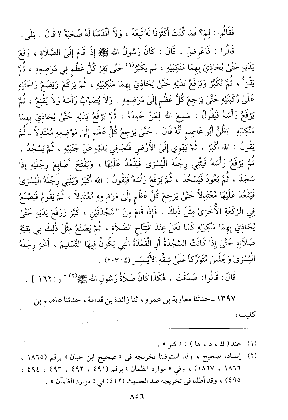 1397 - حَدَّثَنَا مُعَاوِيَةُ بْنُ عَمْرٍو، حَدَّثَنَا زَائِدَةُ بْنُ قُدَامَةَ، حَدَّثَنَا عَاصِمُ بْنُ كُلَيْبٍ، -[857]- أَخْبَرَنِي أَبِي، أَنَّ وَائِلَ بْنَ حُجْرٍ، أَخْبَرَهُ قَالَ: قُلْتُ لَأَنْظُرَنَّ إِلَى صَلَاةِ رَسُولِ اللَّهِ صَلَّى اللهُ عَلَيْهِ وَسَلَّمَ كَيْفَ يُصَلِّي؟ فَنَظَرْتُ إِلَيْهِ " §فَقَامَ فَكَبَّرَ، فَرَفَعَ يَدَيْهِ حَتَّى حَاذَتَا بِأُذُنَيْهِ، وَوَضَعَ يَدَهُ الْيُمْنَى عَلَى ظَهْرِ كَفِّهِ الْيُسْرَى. قَالَ: ثُمَّ لَمَّا أَرَادَ أَنْ يَرْكَعَ، رَفَعَ يَدَيْهِ مِثْلَهَا: فَوَضَعَ يَدَيْهِ عَلَى رُكْبَتَيْهِ، ثُمَّ رَفَعَ رَأْسَهُ، فَرَفَعَ يَدَيْهِ مِثْلَهَا، ثُمَّ سَجَدَ فَجَعَلَ كَفَّيْهِ بِحِذَاءِ أُذُنَيْهِ، ثُمَّ قَعَدَ فَافْتَرَشَ رِجْلَهُ الْيُسْرَى، وَوَضَعَ كَفَّهُ الْيُسْرَى عَلَى فَخِذِهِ وَرُكْبَتِهِ الْيُسْرَى، وَجَعَلَ مِرْفَقَهُ الْأَيْمَنَ عَلَى فَخْذِهِ الْيُمْنَى، ثُمَّ قَبَضَ ثِنْتَيْنِ. فَحَلَّقَ حَلْقَةً، ثُمَّ رَفَعَ أُصْبُعَهُ فَرَأَيْتُهُ يُحَرِّكُهَا: يَدْعُو بِهَا " قَالَ: ثُمَّ جِئْتُ بَعْدَ ذَلِكَ فِي زَمَانٍ فِيهِ بَرْدٌ، فَرَأَيْتُ عَلَى النَّاسِ جُلَّ الثِّيَابِ يُحَرِّكُونَ أَيْدِيَهُمْ مِنْ تَحْتِ الثِّيَابِQإسناده صحيح