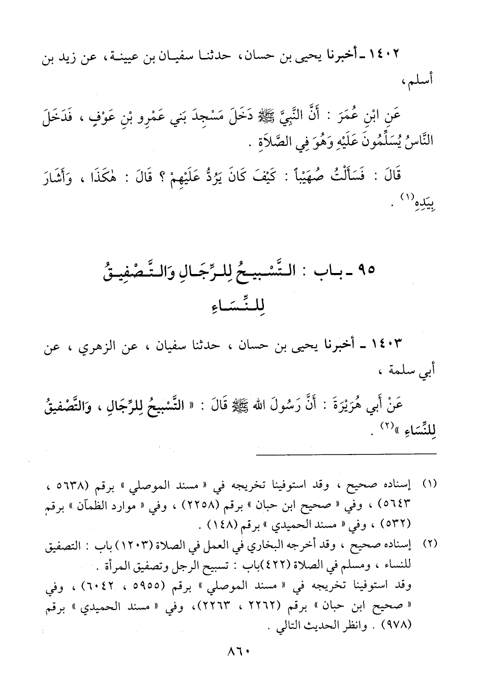 1402 - أَخْبَرَنَا يَحْيَى بْنُ حَسَّانَ، حَدَّثَنَا سُفْيَانُ بْنُ عُيَيْنَةَ، عَنْ زَيْدِ بْنِ أَسْلَمَ، عَنِ ابْنِ عُمَرَ، أَنَّ النَّبِيَّ صَلَّى اللهُ عَلَيْهِ وَسَلَّمَ " دَخَلَ مَسْجِدَ بَنِي عَمْرِو بْنِ عَوْفٍ، فَدَخَلَ النَّاسُ §يُسَلِّمُونَ عَلَيْهِ وَهُوَ فِي الصَّلَاةِ. قَالَ: فَسَأَلْتُ صُهَيْبًا: كَيْفَ كَانَ يَرُدُّ عَلَيْهِمْ؟ قَالَ: هَكَذَا، وَأَشَارَ بِيَدِهِ "Qإسناده صحيح