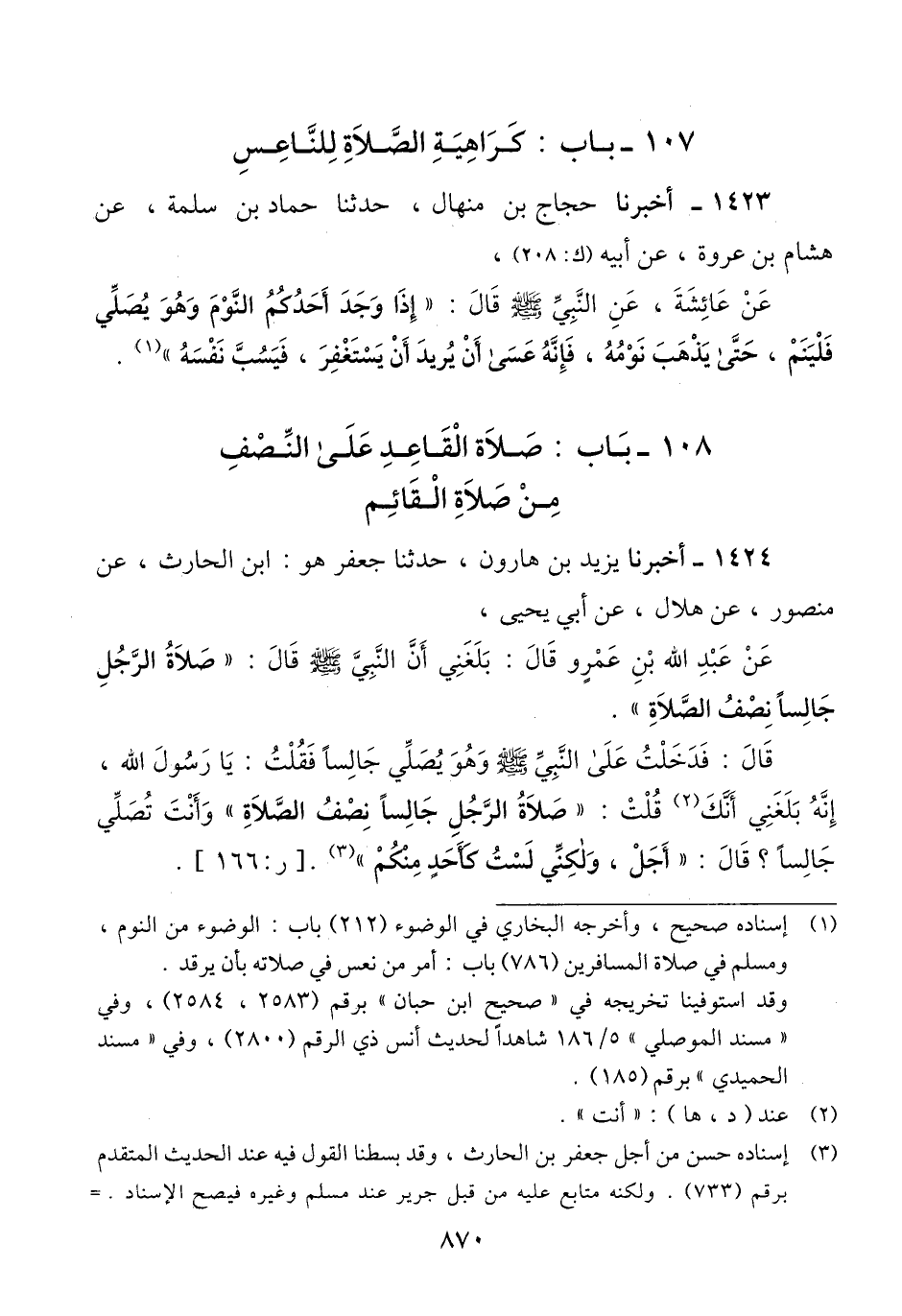 1423 - أَخْبَرَنَا حَجَّاجُ بْنُ مِنْهَالٍ، حَدَّثَنَا حَمَّادُ بْنُ سَلَمَةَ، عَنْ هِشَامِ بْنِ عُرْوَةَ، عَنْ أَبِيهِ، عَنْ عَائِشَةَ، عَنِ النَّبِيِّ صَلَّى اللهُ عَلَيْهِ وَسَلَّمَ قَالَ: «§إِذَا وَجَدَ أَحَدُكُمُ النَّوْمَ وَهُوَ يُصَلِّي فَلْيَنَمْ، حَتَّى يَذْهَبَ نَوْمُهُ، فَإِنَّهُ عَسَى يُرِيدُ أَنْ يَسْتَغْفِرَ، فَيَسُبَّ نَفْسَهُ» Qإسناده صحيح