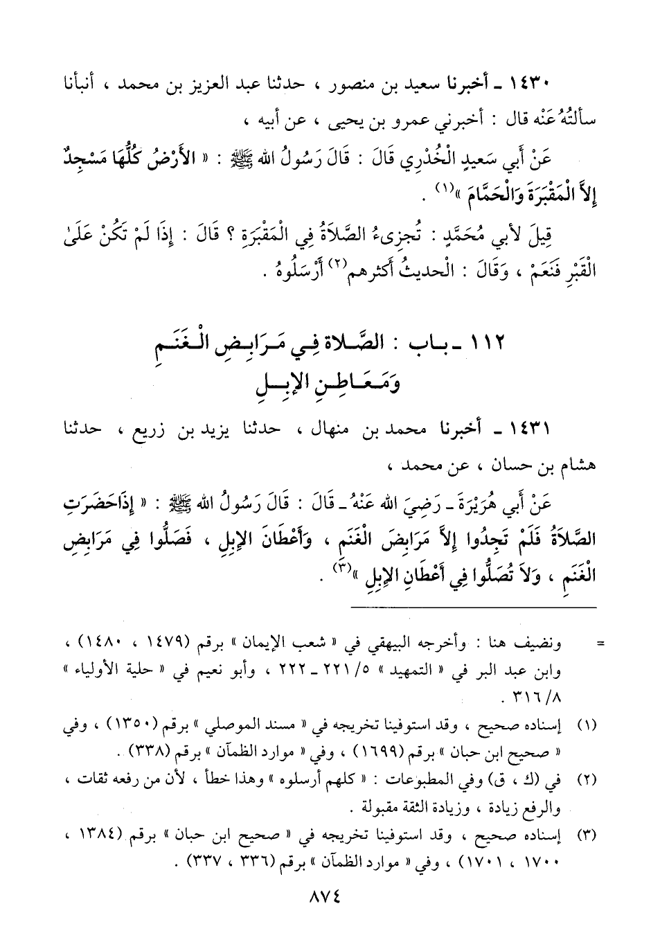 1431 - أَخْبَرَنَا مُحَمَّدُ بْنُ مِنْهَالٍ، حَدَّثَنَا يَزِيدُ بْنُ زُرَيْعٍ، حَدَّثَنَا هِشَامُ بْنُ حَسَّانَ، عَنْ مُحَمَّدٍ، عَنْ أَبِي هُرَيْرَةَ رَضِيَ اللَّهُ عَنْهُ، قَالَ: قَالَ رَسُولُ اللَّهِ صَلَّى اللهُ عَلَيْهِ وَسَلَّمَ: «§إِذَا حَضَرَتِ الصَّلَاةُ فَلَمْ تَجِدُوا إِلَّا مَرَابِضَ الْغَنَمِ، وَأَعْطَانَ الْإِبِلِ، فَصَلُّوا فِي مَرَابِضِ الْغَنَمِ، وَلَا تُصَلُّوا فِي أَعْطَانِ الْإِبِلِ» Qإسناده صحيح