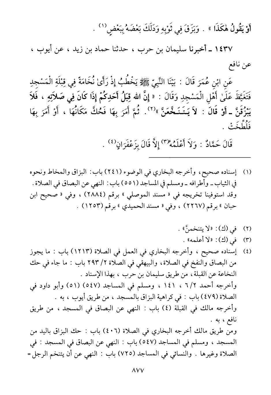 1437 - أَخْبَرَنَا سُلَيْمَانُ بْنُ حَرْبٍ، حَدَّثَنَا حَمَّادُ بْنُ زَيْدٍ، عَنْ أَيُّوبَ، عَنْ نَافِعٍ، عَنِ ابْنِ عُمَرَ، قَالَ: بَيْنَا النَّبِيُّ صَلَّى اللهُ عَلَيْهِ وَسَلَّمَ يَخْطُبُ إِذْ رَأَى نُخَامَةً فِي قِبْلَةِ الْمَسْجِدِ فَتَغَيَّظَ عَلَى أَهْلِ الْمَسْجِدِ وَقَالَ: " §إِنَّ اللَّهَ قِبَلَ أَحَدِكُمْ إِذَا كَانَ فِي صَلَاتِهِ، فَلَا يَبْزُقَنَّ - أَوْ قَالَ: لَا يَتَنَخَّعَنَّ - " ثُمَّ أَمَرَ بِهَا فَحُكَّ مَكَانُهَا، وَأَمَرَ بِهَا فَلُطِخَتْ قَالَ حَمَّادٌ: وَلَا أَعْلَمُهُ إِلَّا قَالَ بِزَعْفَرَانٍQإسناده صحيح