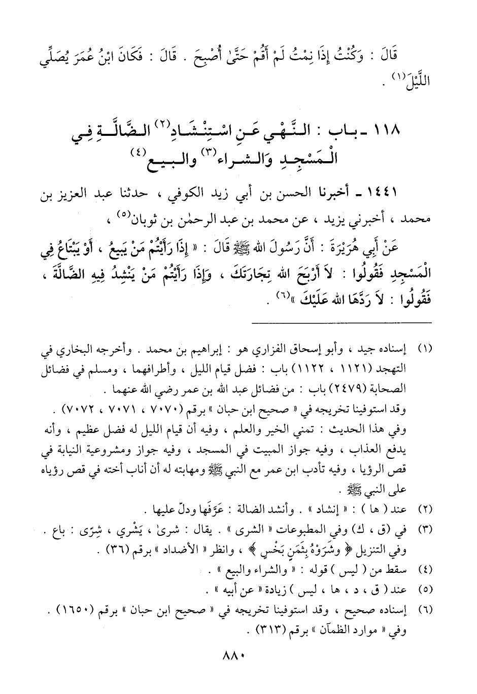 1441 - أَخْبَرَنَا الْحَسَنُ بْنُ أَبِي زَيْدٍ الْكُوفِيُّ، حَدَّثَنَا عَبْدُ الْعَزِيزِ بْنُ مُحَمَّدٍ، أَخْبَرَنِي يَزِيدُ َ، عَنْ مُحَمَّدِ بْنِ عَبْدِ الرَّحْمَنِ بْنِ ثَوْبَانَ، عَنْ أَبِي هُرَيْرَةَ، أَنَّ رَسُولَ اللَّهِ صَلَّى اللهُ عَلَيْهِ وَسَلَّمَ قَالَ: " §إِذَا رَأَيْتُمْ مَنْ يَبِيعُ، أَوْ يَبْتَاعُ فِي الْمَسْجِدِ، فَقُولُوا: لَا أَرْبَحَ اللَّهُ تِجَارَتَكَ، وَإِذَا رَأَيْتُمْ مَنْ يَنْشُدُ فِيهِ الضَّالَّةَ، فَقُولُوا: لَا رَدَّهَا اللَّهُ عَلَيْكَ "Qإسناده صحيح