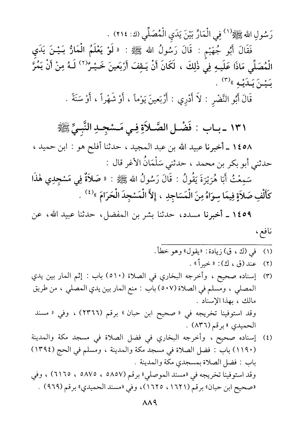 1459 - أَخْبَرَنَا مُسَدَّدٌ، حَدَّثَنَا بِشْرُ بْنُ الْمُفَضَّلِ، حَدَّثَنَا عُبَيْدُ اللَّهِ، عَنْ نَافِعٍ، -[890]- عَنِ ابْنِ عُمَرَ، قَالَ: قَالَ رَسُولُ اللَّهِ صَلَّى اللهُ عَلَيْهِ وَسَلَّمَ: «§صَلَاةٌ فِي مَسْجِدِي هَذَا، أَفْضَلُ مِنْ أَلْفِ صَلَاةٍ فِيمَا سِوَاهُ، إِلَّا الْمَسْجِدَ الْحَرَامَ» Qإسناده صحيح