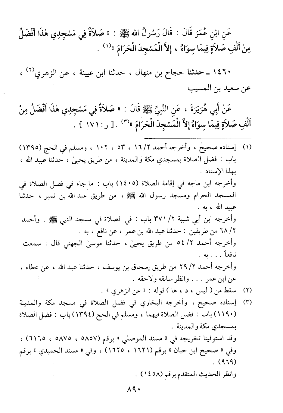 1460 - حَدَّثَنَا حَجَّاجُ بْنُ مِنْهَالٍ، حَدَّثَنَا ابْنُ عُيَيْنَةَ، عَنِ الزُّهْرِيِّ، عَنْ سَعِيدِ بْنِ الْمُسَيِّبِ، عَنْ أَبِي هُرَيْرَةَ، عَنِ النَّبِيِّ صَلَّى اللهُ عَلَيْهِ وَسَلَّمَ قَالَ: «§صَلَاةٌ فِي مَسْجِدِي هَذَا أَفْضَلُ مِنْ أَلْفِ صَلَاةٍ فِيمَا سِوَاهُ، إِلَّا الْمَسْجِدَ الْحَرَامَ» Qإسناده صحيح