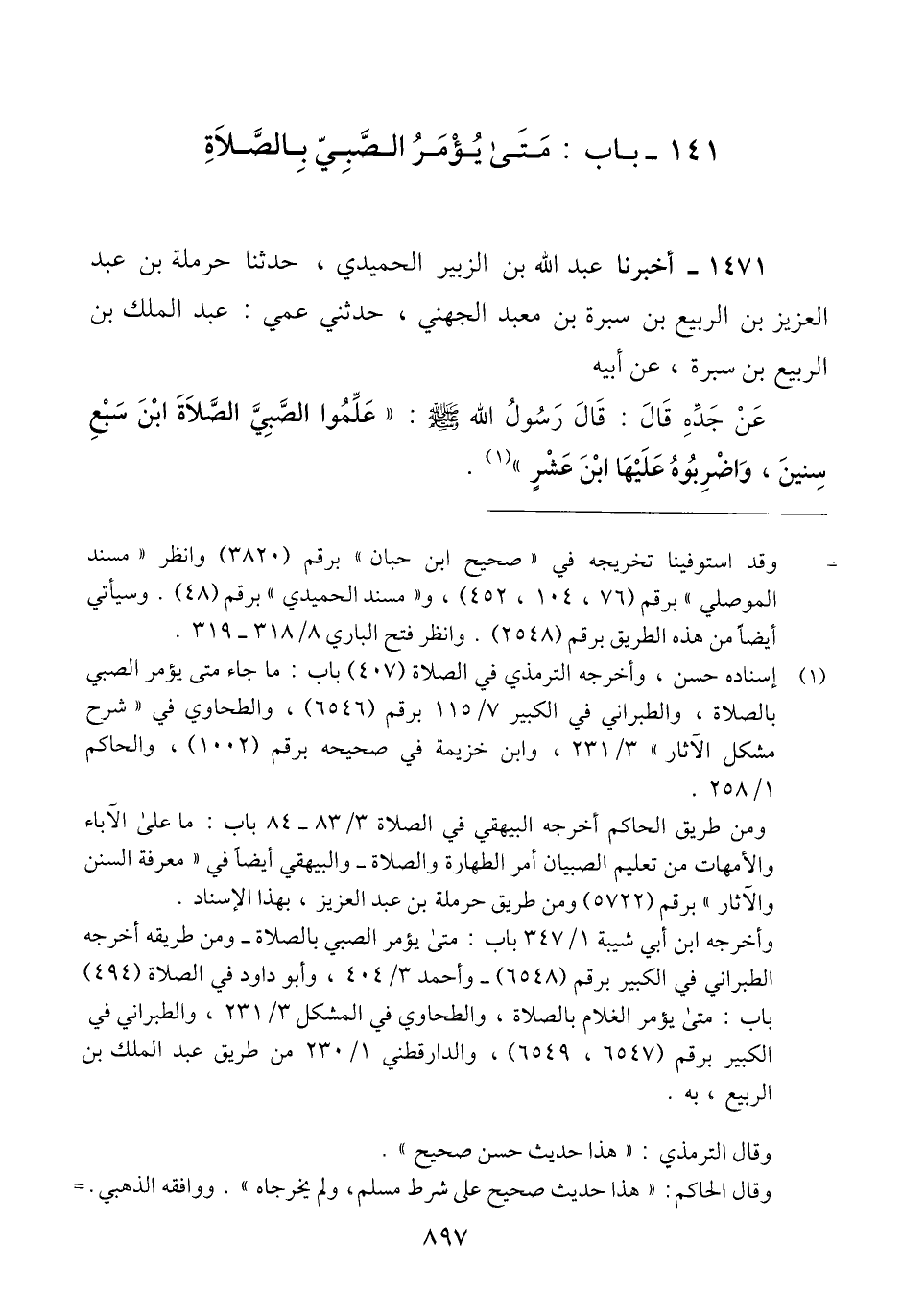1471 - أَخْبَرَنَا عَبْدُ اللَّهِ بْنُ الزُّبَيْرِ الْحُمَيْدِيُّ، حَدَّثَنَا حَرْمَلَةُ بْنُ عَبْدِ الْعَزِيزِ بْنِ الرَّبِيعِ بْنِ سَبْرَةَ بْنِ مَعْبَدٍ الْجُهَنِيُّ، حَدَّثَنِي عَمِّي عَبْدُ الْمَلِكِ بْنُ الرَّبِيعِ بْنِ سَبْرَةَ، عَنْ أَبِيهِ، عَنْ جَدِّهِ، قَالَ: قَالَ رَسُولُ اللَّهِ صَلَّى اللهُ عَلَيْهِ وَسَلَّمَ: «§عَلِّمُوا الصَّبِيَّ الصَّلَاةَ ابْنَ سَبْعِ سِنِينَ، وَاضْرِبُوهُ عَلَيْهَا ابْنَ عَشْرٍ» Qإسناده حسن