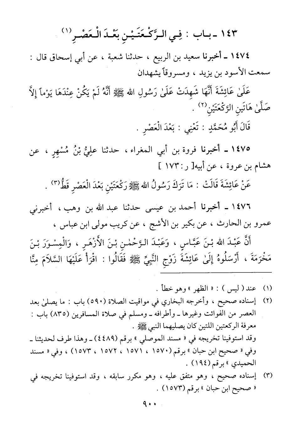 1475 - أَخْبَرَنَا فَرْوَةُ بْنُ أَبِي الْمَغْرَاءِ، حَدَّثَنَا عَلِيُّ بْنُ مُسْهِرٍ، عَنْ هِشَامِ بْنِ عُرْوَةَ، عَنْ أَبِيهِ، عَنْ عَائِشَةَ، قَالَتْ: «§مَا تَرَكَ رَسُولُ اللَّهِ صَلَّى اللهُ عَلَيْهِ وَسَلَّمَ رَكْعَتَيْنِ بَعْدَ الْعَصْرِ قَطُّ» Qإسناده صحيح وهو متفق عليه