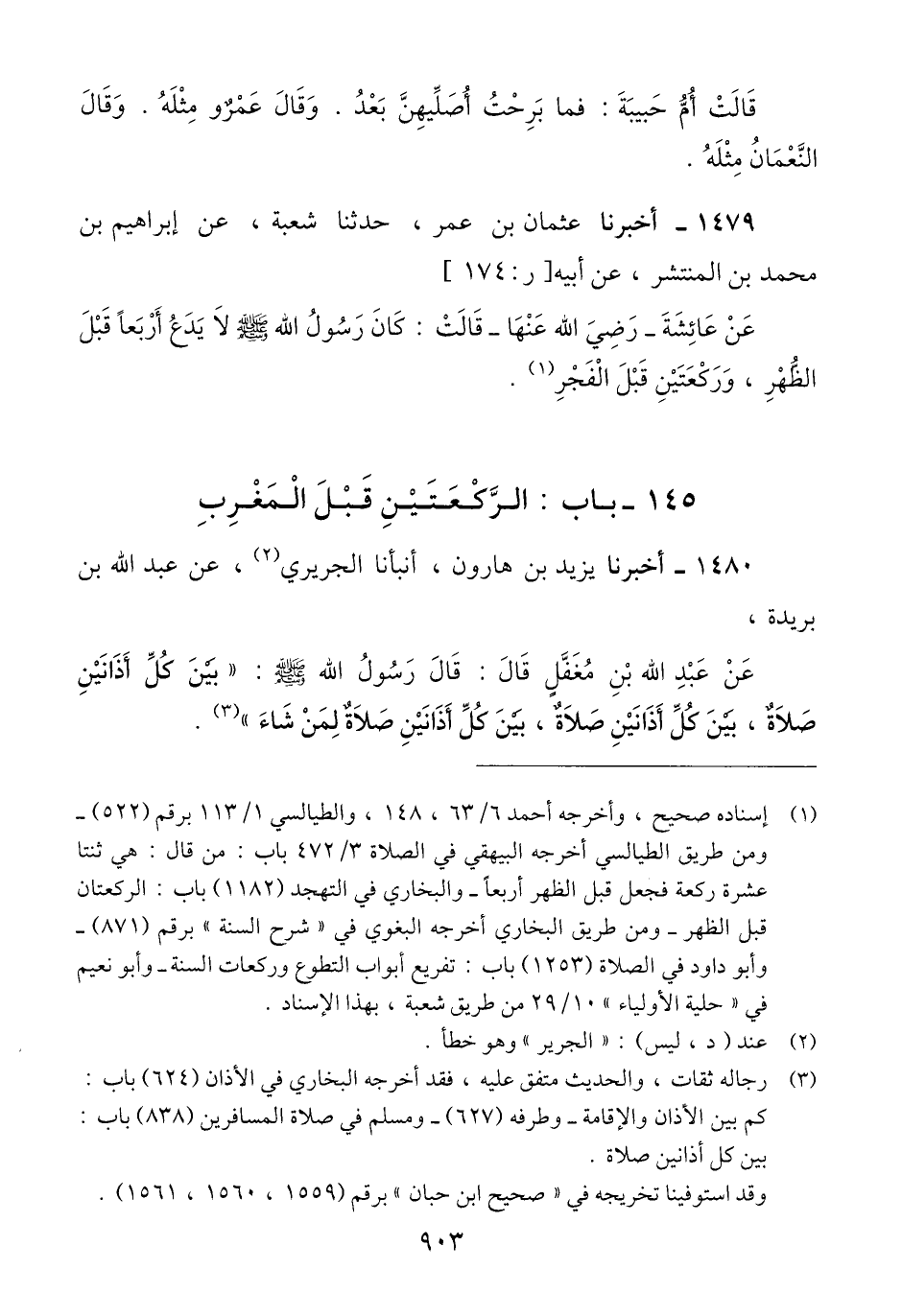 1479 - أَخْبَرَنَا عُثْمَانُ بْنُ عُمَرَ، حَدَّثَنَا شُعْبَةُ، عَنْ إِبْرَاهِيمَ بْنِ مُحَمَّدِ بْنِ الْمُنْتَشِرِ، عَنْ أَبِيهِ، عَنْ عَائِشَةَ رَضِيَ اللَّهُ عَنْهَا، قَالَتْ: كَانَ رَسُولُ اللَّهِ صَلَّى اللهُ عَلَيْهِ وَسَلَّمَ «§لَا يَدَعُ أَرْبَعًا قَبْلَ الظُّهْرِ، وَرَكْعَتَيْنِ قَبْلَ الْفَجْرِ» Qإسناده صحيح