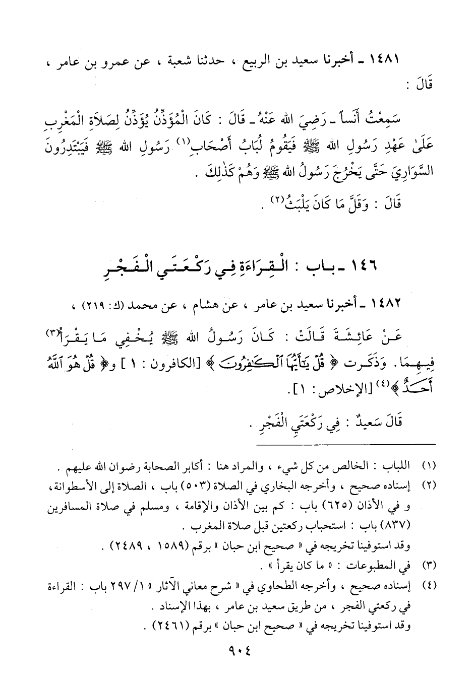 1481 - أَخْبَرَنَا سَعِيدُ بْنُ الرَّبِيعِ، حَدَّثَنَا شُعْبَةُ، عَنْ عَمْرِو بْنِ عَامِرٍ، قَالَ: سَمِعْتُ أَنَسًا رَضِيَ اللَّهُ عَنْهُ، قَالَ: كَانَ «§الْمُؤَذِّنُ يُؤَذِّنُ لِصَلَاةِ الْمَغْرِبِ عَلَى عَهْدِ رَسُولِ اللَّهِ صَلَّى اللهُ عَلَيْهِ وَسَلَّمَ فَيَقُومُ لُبَابُ أَصْحَابِ رَسُولِ اللَّهِ صَلَّى اللهُ عَلَيْهِ وَسَلَّمَ فَيَبْتَدِرُونَ السَّوَارِيَ حَتَّى يَخْرُجَ رَسُولُ اللَّهِ صَلَّى اللهُ عَلَيْهِ وَسَلَّمَ وَهُمْ كَذَلِكَ» قَالَ: وَقَلَّ مَا كَانَ يَلْبَثُQإسناده صحيح