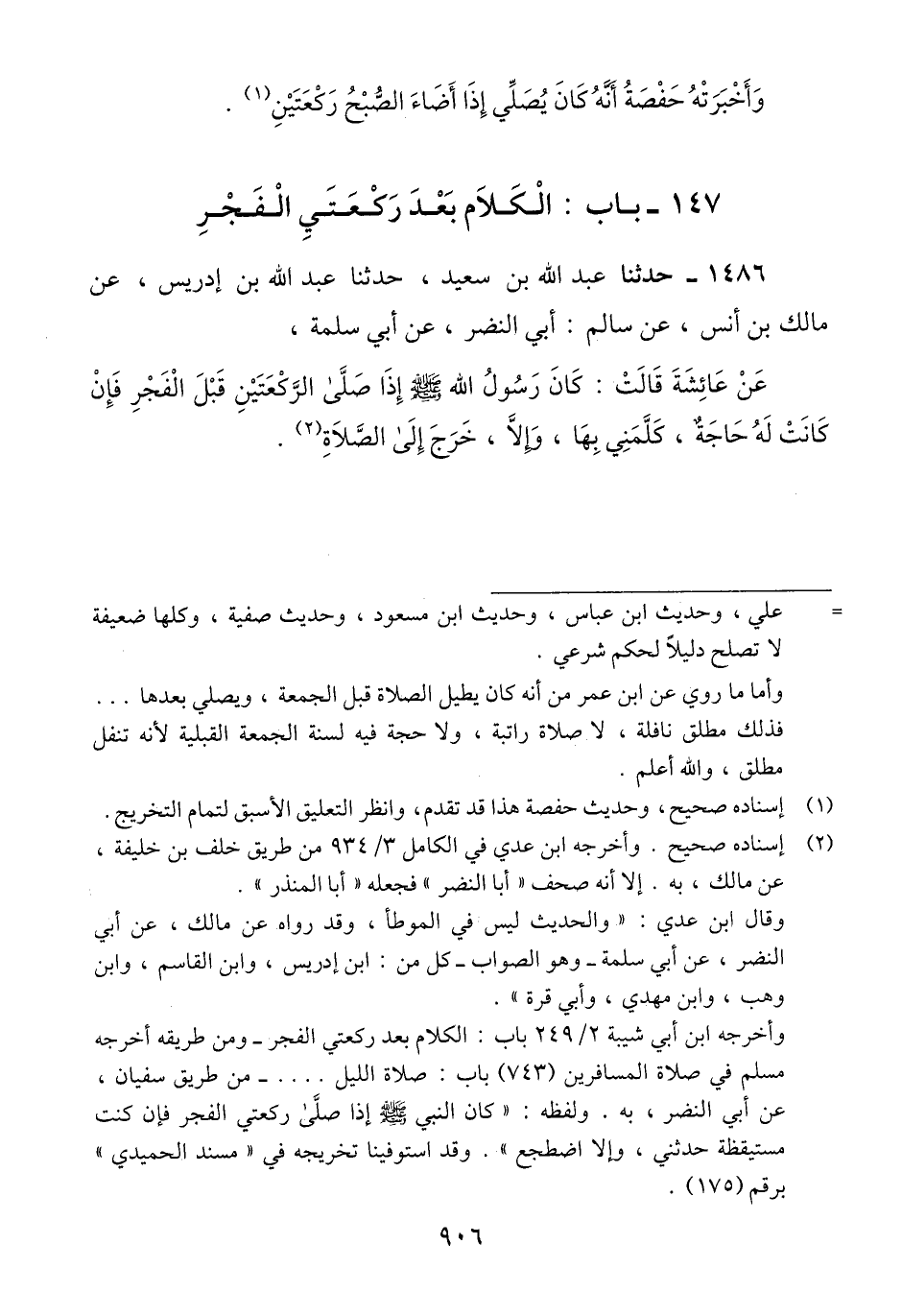 1486 - حَدَّثَنَا عَبْدُ اللَّهِ بْنُ سَعِيدٍ، حَدَّثَنَا عَبْدُ اللَّهِ بْنُ إِدْرِيسَ، عَنْ مَالِكِ بْنِ أَنَسٍ، عَنْ سَالِمٍ أَبِي النَّضْرِ، عَنْ أَبِي سَلَمَةَ، عَنْ عَائِشَةَ، قَالَتْ: كَانَ رَسُولُ اللَّهِ صَلَّى اللهُ عَلَيْهِ وَسَلَّمَ «§إِذَا صَلَّى الرَّكْعَتَيْنِ قَبْلَ الْفَجْرِ، فَإِنْ كَانَتْ لَهُ حَاجَةٌ، كَلَّمَنِي بِهَا، وَإِلَّا، خَرَجَ إِلَى الصَّلَاةِ» Qإسناده صحيح