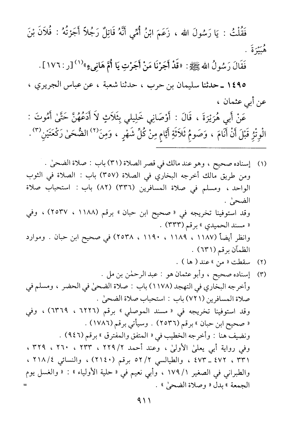 1495 - حَدَّثَنَا سُلَيْمَانُ بْنُ حَرْبٍ، حَدَّثَنَا شُعْبَةُ، عَنْ عَبَّاسٍ الْجُرَيْرِيِّ، عَنْ أَبِي عُثْمَانَ، عَنْ أَبِي هُرَيْرَةَ، قَالَ: " أَوْصَانِي خَلِيلِي بِثَلَاثٍ لَا أَدَعُهُنَّ حَتَّى أَمُوتَ: §الْوِتْرِ قَبْلَ أَنْ أَنَامَ، وَصَوْمِ ثَلَاثَةِ أَيَّامٍ مِنْ كُلِّ شَهْرٍ، وَمِنَ الضُّحَى رَكْعَتَيْنِ "Qإسناده صحيح