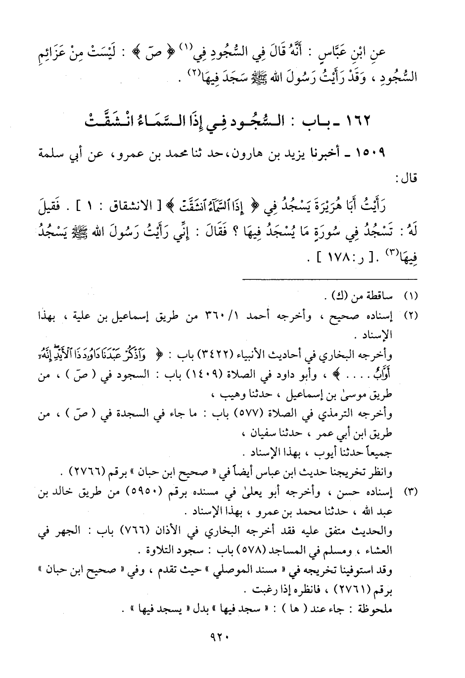 1509 - أَخْبَرَنَا يَزِيدُ بْنُ هَارُونَ، حَدَّثَنَا مُحَمَّدُ بْنُ عَمْرٍو، عَنْ أَبِي سَلَمَةَ قَالَ: رَأَيْتُ أَبَا هُرَيْرَةَ يَسْجُدُ فِي إِذَا السَّمَاءُ انْشَقَّتْ، فَقِيلَ لَهُ: تَسْجُدُ فِي سُورَةٍ مَا يُسْجَدُ فِيهَا؟، فَقَالَ: «إِنِّي §رَأَيْتُ رَسُولَ اللَّهِ صَلَّى اللهُ عَلَيْهِ وَسَلَّمَ، يَسْجُدُ فِيهَا» Qإسناده حسن