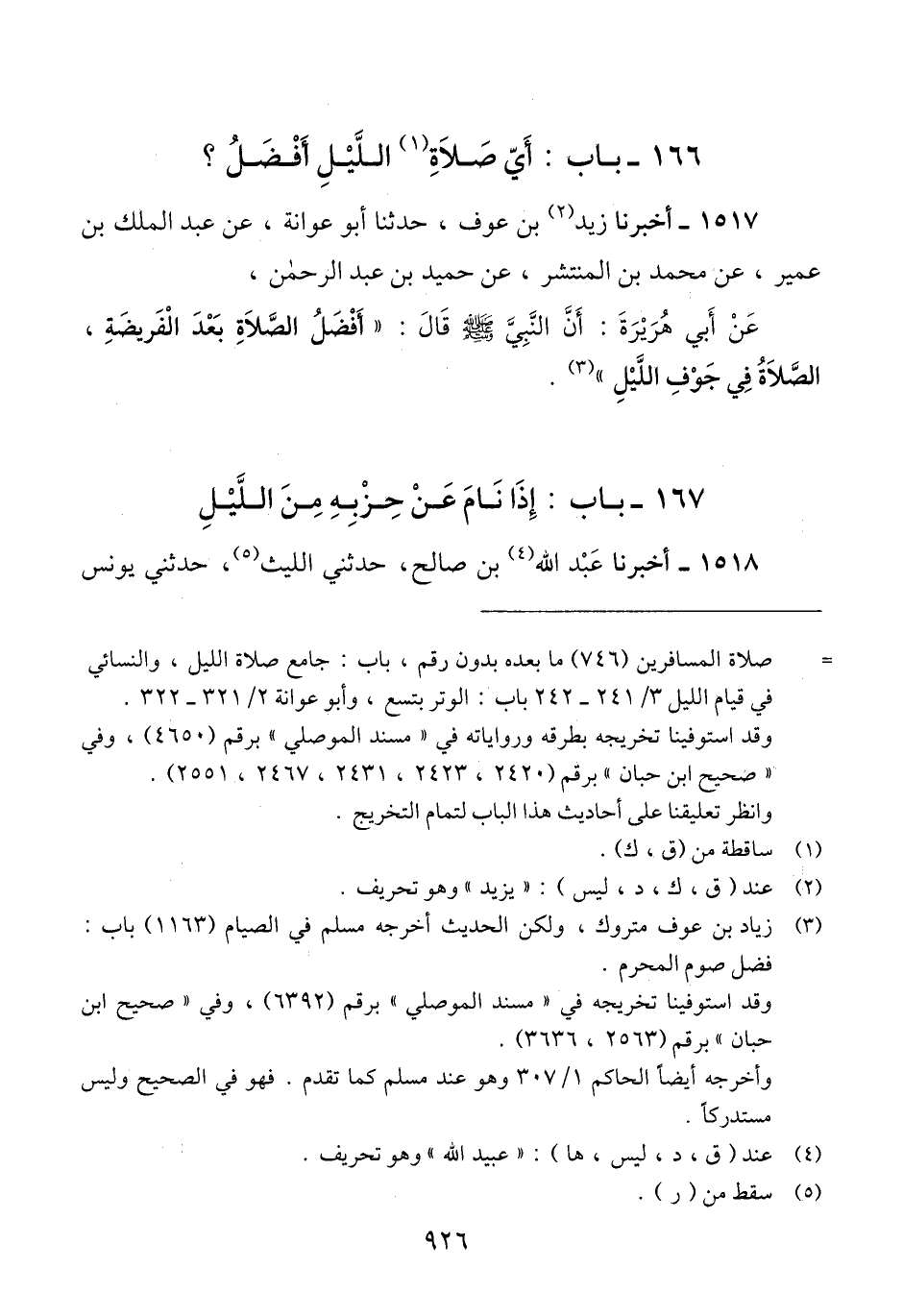 1517 - أَخْبَرَنَا زَيْدُ بْنُ عَوْفٍ، حَدَّثَنَا أَبُو عَوَانَةَ، عَنْ عَبْدِ الْمَلِكِ بْنِ عُمَيْرٍ، عَنْ مُحَمَّدِ بْنِ الْمُنْتَشِرِ، عَنْ حُمَيْدِ بْنِ عَبْدِ الرَّحْمَنِ، عَنْ أَبِي هُرَيْرَةَ، أَنَّ النَّبِيَّ صَلَّى اللهُ عَلَيْهِ وَسَلَّمَ قَالَ: «§أَفْضَلُ الصَّلَاةِ بَعْدَ الْفَرِيضَةِ، الصَّلَاةُ فِي جَوْفِ اللَّيْلِ» Qلم يحكم عليه المحقق