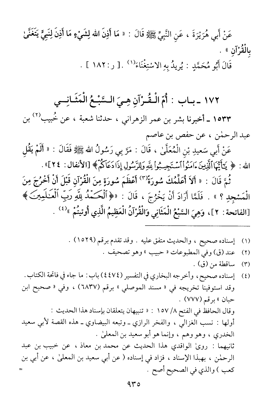1533 - أَخْبَرَنَا بِشْرُ بْنُ عُمَرَ الزَّهْرَانِيُّ، حَدَّثَنَا شُعْبَةُ، عَنْ خُبَيْبِ بْنِ عَبْدِ الرَّحْمَنِ، عَنْ حَفْصِ بْنِ عَاصِمٍ، عَنْ أَبِي سَعِيدِ بْنِ الْمُعَلَّى قَالَ: مَرَّ بِي رَسُولُ اللَّهِ صَلَّى اللهُ عَلَيْهِ وَسَلَّمَ فَقَالَ: «أَلَمْ يَقُلِ اللَّهُ»: {يَا أَيُّهَا الَّذِينَ آمَنُوا اسْتَجِيبُوا لِلَّهِ وَلِلرَّسُولِ إِذَا دَعَاكُمْ} [الأنفال: 24]، ثُمَّ قَالَ: «أَلَا §أُعَلِّمُكَ سُورَةً أَعْظَمَ سُورَةٍ مِنَ الْقُرْآنِ قَبْلَ أَنْ أَخْرُجَ مِنَ الْمَسْجِدِ؟»، فَلَمَّا أَرَادَ أَنْ يَخْرُجَ، قَالَ: الْحَمْدُ لِلَّهِ رَبِّ الْعَالَمِينَ، وَهِيَ السَّبْعُ الْمَثَانِي، وَالْقُرْآنُ الْعَظِيمُ الَّذِي أُوتِيتُمْ "Qإسناده صحيح