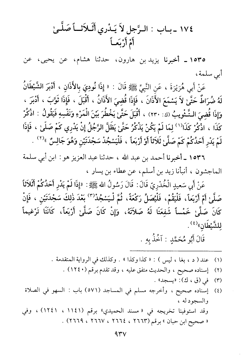 1536 - أَخْبَرَنَا أَحْمَدُ بْنُ عَبْدِ اللَّهِ، حَدَّثَنَا عَبْدُ الْعَزِيزِ هُوَ ابْنُ أَبِي سَلَمَةَ الْمَاجِشُونُ، أَنْبَأَنَا زَيْدُ بْنُ أَسْلَمَ، عَنْ عَطَاءِ بْنِ يَسَارٍ، عَنْ أَبِي سَعِيدٍ الْخُدْرِيِّ قَالَ: قَالَ رَسُولُ اللَّهِ صَلَّى اللهُ عَلَيْهِ وَسَلَّمَ: «§إِذَا لَمْ يَدْرِ أَحَدُكُمْ أَثَلَاثًا صَلَّى أَمْ أَرْبَعًا، فَلْيَقُمْ، فَلْيُصَلِّ رَكْعَةً، ثُمَّ لِيَسْجُدْ بَعْدَ ذَلِكَ سَجْدَتَيْنِ، فَإِنْ كَانَ صَلَّى خَمْسًا شَفَعَتَا لَهُ صَلَاتَهُ، وَإِنْ كَانَ صَلَّى أَرْبَعًا، كَانَتَا تَرْغِيمًا لِلشَّيْطَانِ»، قَالَ أَبُو مُحَمَّد «آخُذُ بِهِ»