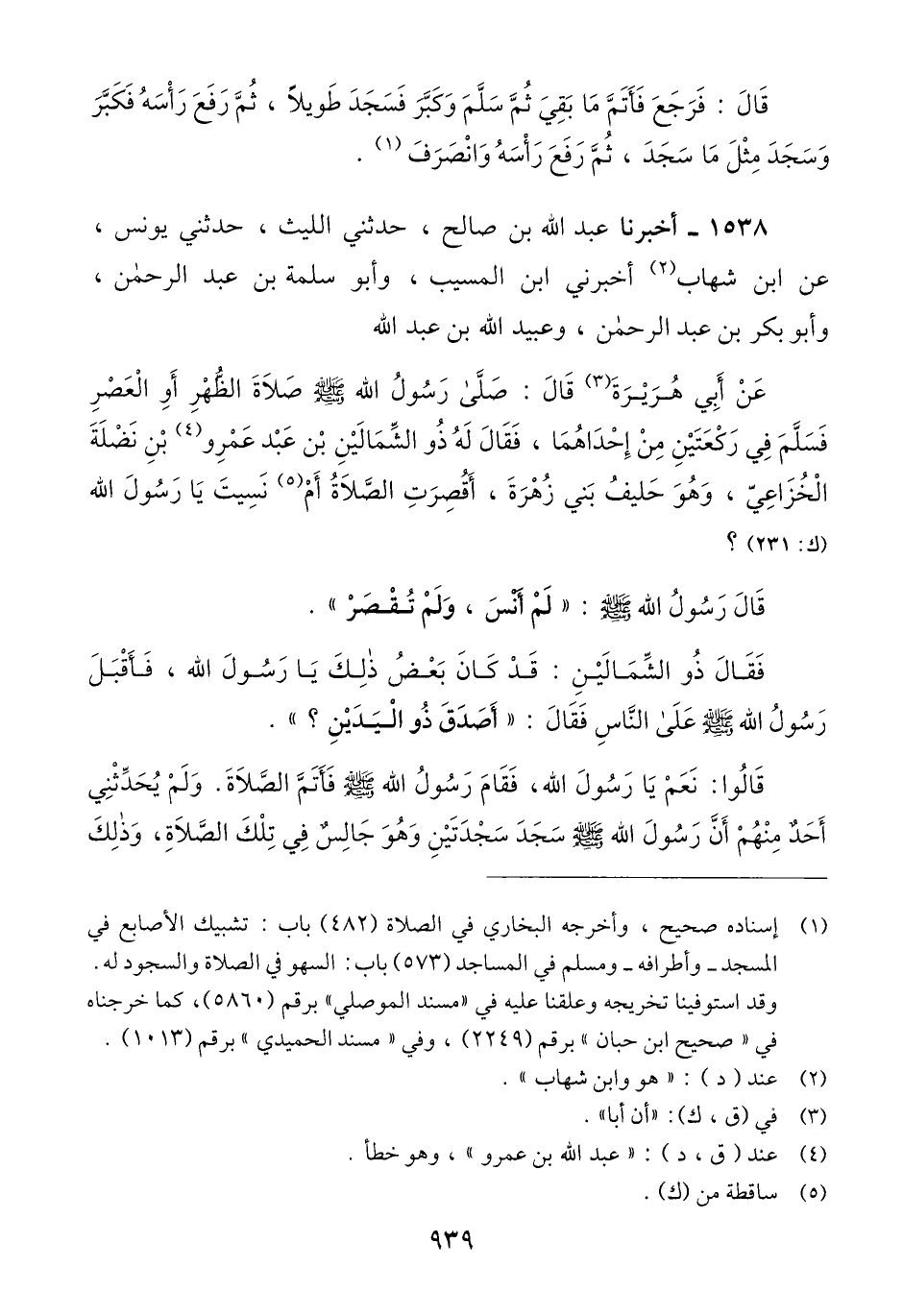 1538 - أَخْبَرَنَا عَبْدُ اللَّهِ بْنُ صَالِحٍ، حَدَّثَنِي اللَّيْثُ، حَدَّثَنِي يُونُسُ، عَنْ ابْنِ شِهَابٍ، أَخْبَرَنِي ابْنُ الْمُسَيَّبِ، وَأَبُو سَلَمَةَ بْنُ عَبْدِ الرَّحْمَنِ، وَأَبُو بَكْرِ بْنُ عَبْدِ الرَّحْمَنِ، وَعُبَيْدُ اللَّهِ بْنُ عَبْدِ اللَّهِ أَنَّ أَبَا هُرَيْرَةَ قَالَ: صَلَّى رَسُولُ اللَّهِ صَلَّى اللهُ عَلَيْهِ وَسَلَّمَ صَلَاةَ الظُّهْرِ أَوِ الْعَصْرِ، فَسَلَّمَ فِي رَكْعَتَيْنِ مِنْ إِحْدَاهُمَا، فَقَالَ لَهُ ذُو الشِّمَالَيْنِ بْنُ عَبْدِ عَمْرِو بْنِ نَضْلَةَ الْخُزَاعِيُّ - وَهُوَ حَلِيفُ بَنِي زُهْرَةَ -: أَقُصِرَتْ أَمْ نَسِيتَ يَا رَسُولَ اللَّهِ؟ قَالَ رَسُولُ اللَّهِ صَلَّى اللهُ عَلَيْهِ وَسَلَّمَ: «§لَمْ أَنْسَ وَلَمْ تُقْصَرْ»، فَقَالَ ذُو الشِّمَالَيْنِ: قَدْ كَانَ بَعْضُ ذَلِكَ يَا رَسُولَ اللَّهِ، فَأَقْبَلَ رَسُولُ اللَّهِ صَلَّى اللهُ عَلَيْهِ وَسَلَّمَ عَلَى النَّاسِ، فَقَالَ: «أَصَدَقَ ذُو الْيَدَيْنِ؟»، قَالُوا: نَعَمْ، يَا رَسُولَ اللَّهِ، فَقَامَ رَسُولُ اللَّهِ صَلَّى اللهُ عَلَيْهِ وَسَلَّمَ فَأَتَمَّ الصَّلَاةَ، وَلَمْ يُحَدِّثْنِي أَحَدٌ مِنْهُمْ أَنَّ رَسُولَ اللَّهِ صَلَّى اللهُ عَلَيْهِ وَسَلَّمَ سَجَدَ سَجْدَتَيْنِ وَهُوَ جَالِسٌ فِي تِلْكَ الصَّلَاةِ، وَذَلِكَ -[940]- فِيمَا يُرَى وَاللَّهُ أَعْلَمُ مِنْ أَجْلِ أَنَّ النَّاسَ يَقَّنُوا رَسُولَ اللَّهِ صَلَّى اللهُ عَلَيْهِ وَسَلَّمَ حَتَّى اسْتَيْقَنَQإسناده ضعيف من أجل عبد الله بن صالح كاتب الليث