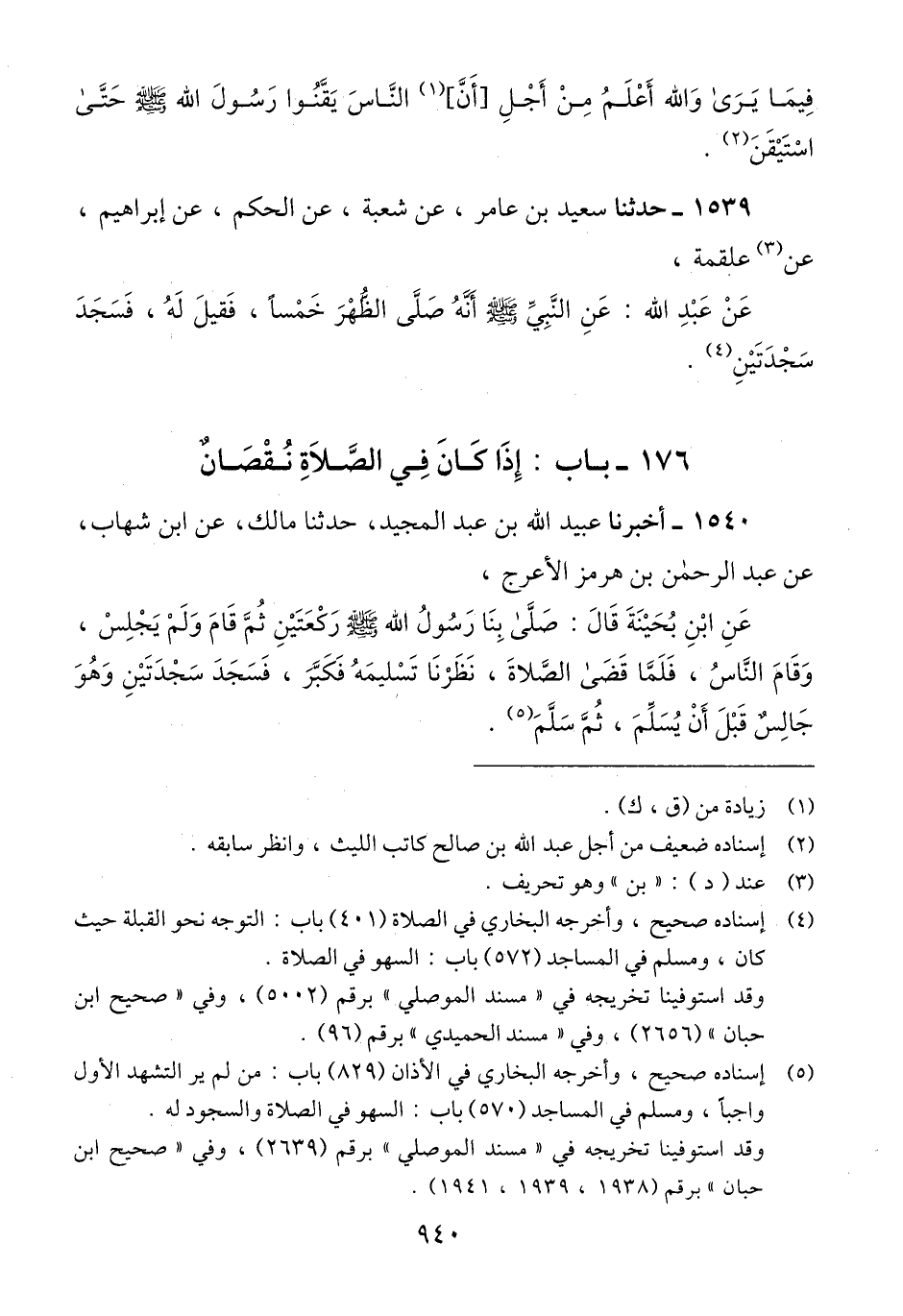 1539 - حَدَّثَنَا سَعِيدُ بْنُ عَامِرٍ، عَنْ شُعْبَةَ، عَنْ الْحَكَمِ، عَنْ إِبْرَاهِيمَ، عَنْ عَلْقَمَةَ، عَنْ عَبْدِ اللَّهِ، عَنِ النَّبِيِّ اللَّهُ عَلَيْهِ وَسَلَّمَ «أَنَّهُ §صَلَّى الظُّهْرَ خَمْسًا، فَقِيلَ لَهُ، فَسَجَدَ سَجْدَتَيْنِ» Qإسناده صحيح