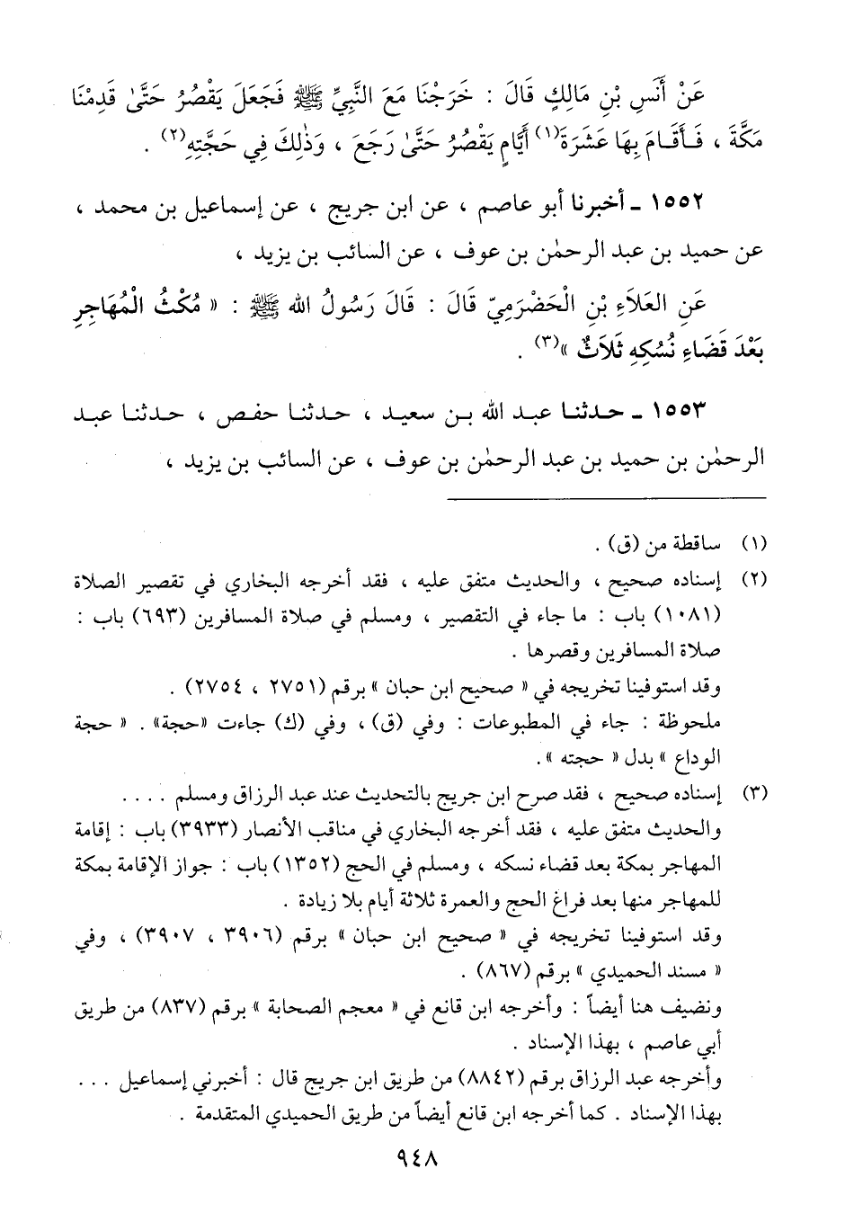 1552 - أَخْبَرَنَا أَبُو عَاصِمٍ، عَنْ ابْنِ جُرَيْجٍ، عَنْ إِسْمَاعِيلَ بْنِ مُحَمَّدٍ، عَنْ حُمَيْدِ بْنِ عَبْدِ الرَّحْمَنِ بْنِ عَوْفٍ، عَنْ السَّائِبِ بْنِ يَزِيدَ، عَنْ الْعَلَاءِ بْنِ الْحَضْرَمِيِّ قَالَ: قَالَ رَسُولُ اللَّهِ صَلَّى اللهُ عَلَيْهِ وَسَلَّمَ «§مُكْثُ الْمُهَاجِرِ بَعْدَ قَضَاءِ نُسُكِهِ ثَلَاثٌ» Qإسناده صحيح