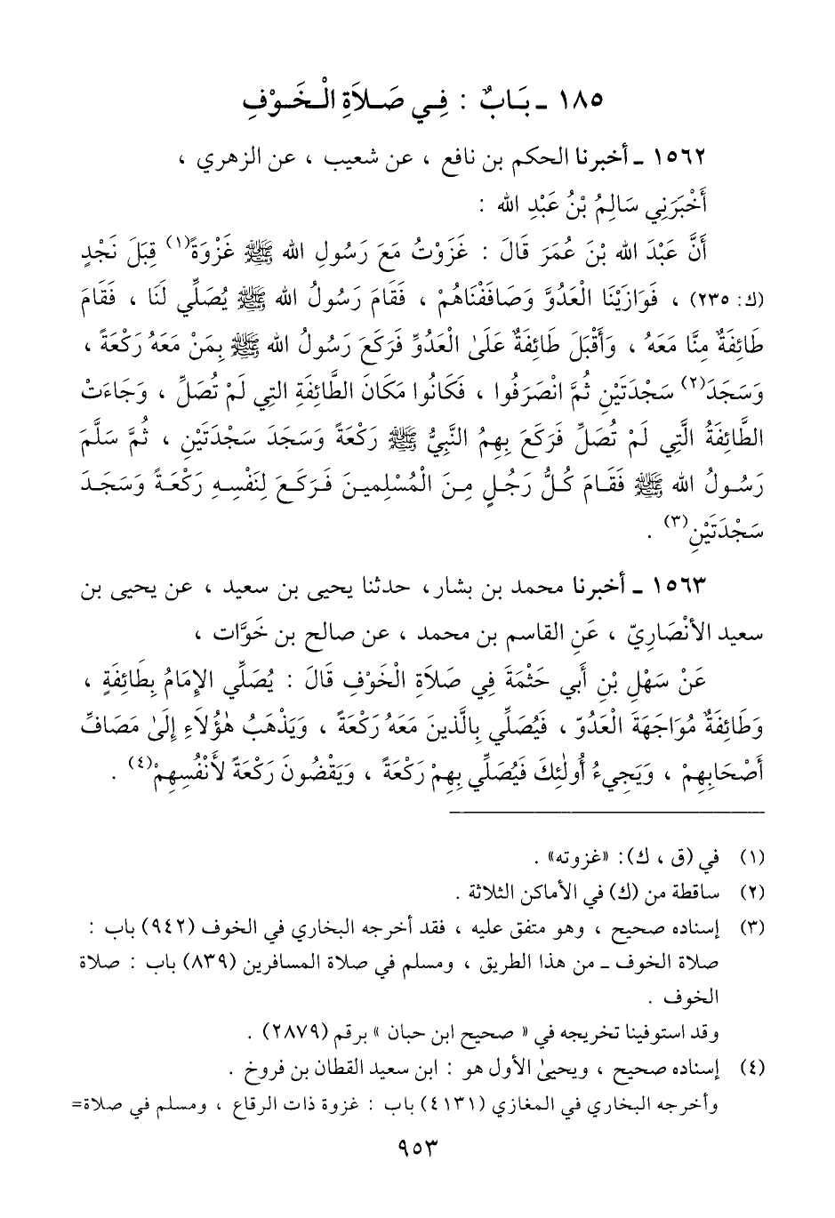 1562 - أَخْبَرَنَا الْحَكَمُ بْنُ نَافِعٍ، عَنْ شُعَيْبٍ، عَنْ الزُّهْرِيِّ، أَخْبَرَنِي سَالِمُ بْنُ عَبْدِ اللَّهِ، أَنَّ عَبْدَ اللَّهِ بْنَ عُمَرَ قَالَ: «غَزَوْتُ مَعَ رَسُولِ اللَّهِ صَلَّى اللهُ عَلَيْهِ وَسَلَّمَ غَزْوَةً قِبَلَ نَجْدٍ، فَوَازَيْنَا الْعَدُوَّ وَصَافَفْنَاهُمْ،» فَقَامَ رَسُولُ اللَّهِ صَلَّى اللهُ عَلَيْهِ وَسَلَّمَ §يُصَلِّي لَنَا، فَقَامَ طَائِفَةٌ مِنَّا مَعَهُ، وَأَقْبَلَ طَائِفَةٌ عَلَى الْعَدُوِّ فَرَكَعَ رَسُولُ اللَّهِ صَلَّى اللهُ عَلَيْهِ وَسَلَّمَ بِمَنْ مَعَهُ رَكْعَةً، وَسَجَدَ سَجْدَتَيْنِ ثُمَّ انْصَرَفُوا، فَكَانُوا مَكَانَ الطَّائِفَةِ الَّتِي لَمْ تُصَلِّ، وَجَاءَتِ الطَّائِفَةُ الَّتِي لَمْ تُصَلِّ فَرَكَعَ بِهِمُ النَّبِيُّ صَلَّى اللهُ عَلَيْهِ وَسَلَّمَ رَكْعَةً وَسَجَدَ سَجْدَتَيْنِ، ثُمَّ سَلَّمَ رَسُولُ اللَّهِ صَلَّى اللهُ عَلَيْهِ وَسَلَّمَ، فَقَامَ كُلُّ رَجُلٍ مِنَ الْمُسْلِمِينَ فَرَكَعَ لِنَفْسِهِ رَكْعَةً وَسَجَدَ سَجْدَتَيْنِ "Qإسناده صحيح