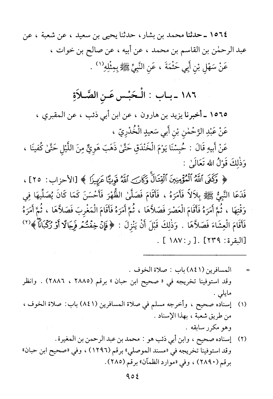 1565 - أَخْبَرَنَا يَزِيدُ بْنُ هَارُونَ، عَنْ ابْنِ أَبِي ذِئْبٍ، عَنْ الْمَقْبُرِيِّ، عَنْ عَبْدِ الرَّحْمَنِ بْنِ أَبِي سَعِيدٍ الْخُدْرِيِّ، عَنْ أَبِيهِ قَالَ: حُبِسْنَا يَوْمَ الْخَنْدَقِ، حَتَّى ذَهَبَ هَوِيٌّ مِنَ اللَّيْلِ حَتَّى كُفِينَا، وَذَلِكَ قَوْلُ اللَّهِ تَعَالَى: {§وَكَفَى اللَّهُ الْمُؤْمِنِينَ الْقِتَالَ وَكَانَ اللَّهُ قَوِيًّا عَزِيزًا} [الأحزاب: 25]، «فَدَعَا النَّبِيُّ صَلَّى اللهُ عَلَيْهِ وَسَلَّمَ بِلَالًا فَأَمَرَهُ، فَأَقَامَ فَصَلَّى الظُّهْرَ فَأَحْسَنَ كَمَا كَانَ يُصَلِّيهَا فِي وَقْتِهَا، ثُمَّ أَمَرَهُ فَأَقَامَ الْعَصْرَ فَصَلَّاهَا، ثُمَّ أَمَرَهُ فَأَقَامَ الْمَغْرِبَ فَصَلَّاهَا، ثُمَّ أَمَرَهُ فَأَقَامَ الْعِشَاءَ فَصَلَّاهَا»، وَذَلِكَ قَبْلَ أَنْ يَنْزِلَ: {فَإِنْ خِفْتُمْ فَرِجَالًا أَوْ رُكْبَانًا} [البقرة: 239] Qإسناده صحيح