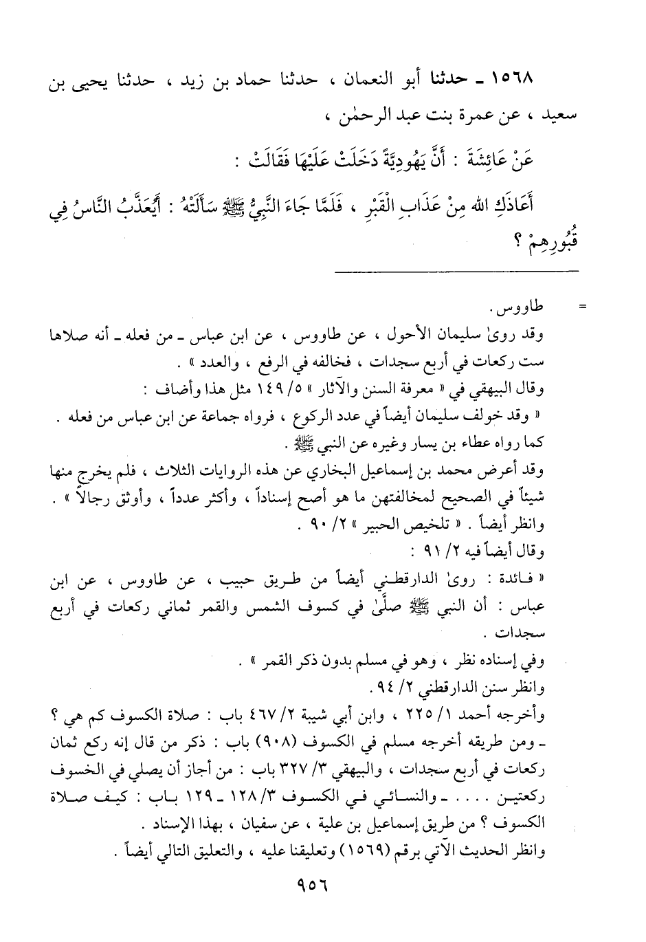 1568 - حَدَّثَنَا أَبُو النُّعْمَانِ، حَدَّثَنَا حَمَّادُ بْنُ زَيْدٍ، حَدَّثَنَا يَحْيَى بْنُ سَعِيدٍ، عَنْ عَمْرَةَ بِنْتِ عَبْدِ الرَّحْمَنِ، عَنْ عَائِشَةَ، أَنَّ يَهُودِيَّةً دَخَلَتْ عَلَيْهَا، فَقَالَتْ: أَعَاذَكِ اللَّهُ مِنْ عَذَابِ الْقَبْرِ، فَلَمَّا جَاءَ النَّبِيُّ صَلَّى اللهُ عَلَيْهِ وَسَلَّمَ سَأَلَتْهُ: §أَيُعَذَّبُ النَّاسُ فِي قُبُورِهِمْ؟ -[957]- قَالَ: «عَائِذًا بِاللَّهِ» Qإسناده صحيح