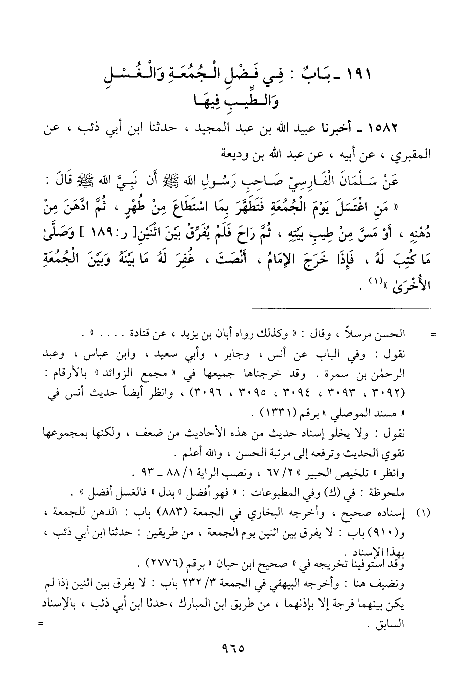 1582 - أَخْبَرَنَا عُبَيْدُ اللَّهِ بْنُ عَبْدِ الْمَجِيدِ، حَدَّثَنَا ابْنُ أَبِي ذِئْبٍ، عَنْ الْمَقْبُرِيِّ، عَنْ أَبِيهِ، عَنْ عَبْدِ اللَّهِ بْنِ وَدِيعَةَ، عَنْ سَلْمَانَ الْفَارِسِيِّ - صَاحِبِ رَسُولِ اللَّهِ صَلَّى اللهُ عَلَيْهِ وَسَلَّمَ -، أَنَّ نَبِيَّ اللَّهِ صَلَّى اللهُ عَلَيْهِ وَسَلَّمَ قَالَ: «§مَنِ اغْتَسَلَ يَوْمَ الْجُمُعَةِ فَتَطَهَّرَ بِمَا اسْتَطَاعَ مِنْ طُهْرٍ، ثُمَّ ادَّهَنَ مِنْ دُهْنِهِ، أَوْ مَسَّ مِنْ طِيبِ بَيْتِهِ، ثُمَّ رَاحَ فَلَمْ يُفَرِّقْ بَيْنَ اثْنَيْنِ، وَصَلَّى مَا كُتِبَ لَهُ، فَإِذَا خَرَجَ الْإِمَامُ أَنْصَتَ، غُفِرَ لَهُ مَا بَيْنَهُ وَبَيْنَ الْجُمُعَةِ الْأُخْرَى» Qإسناده صحيح