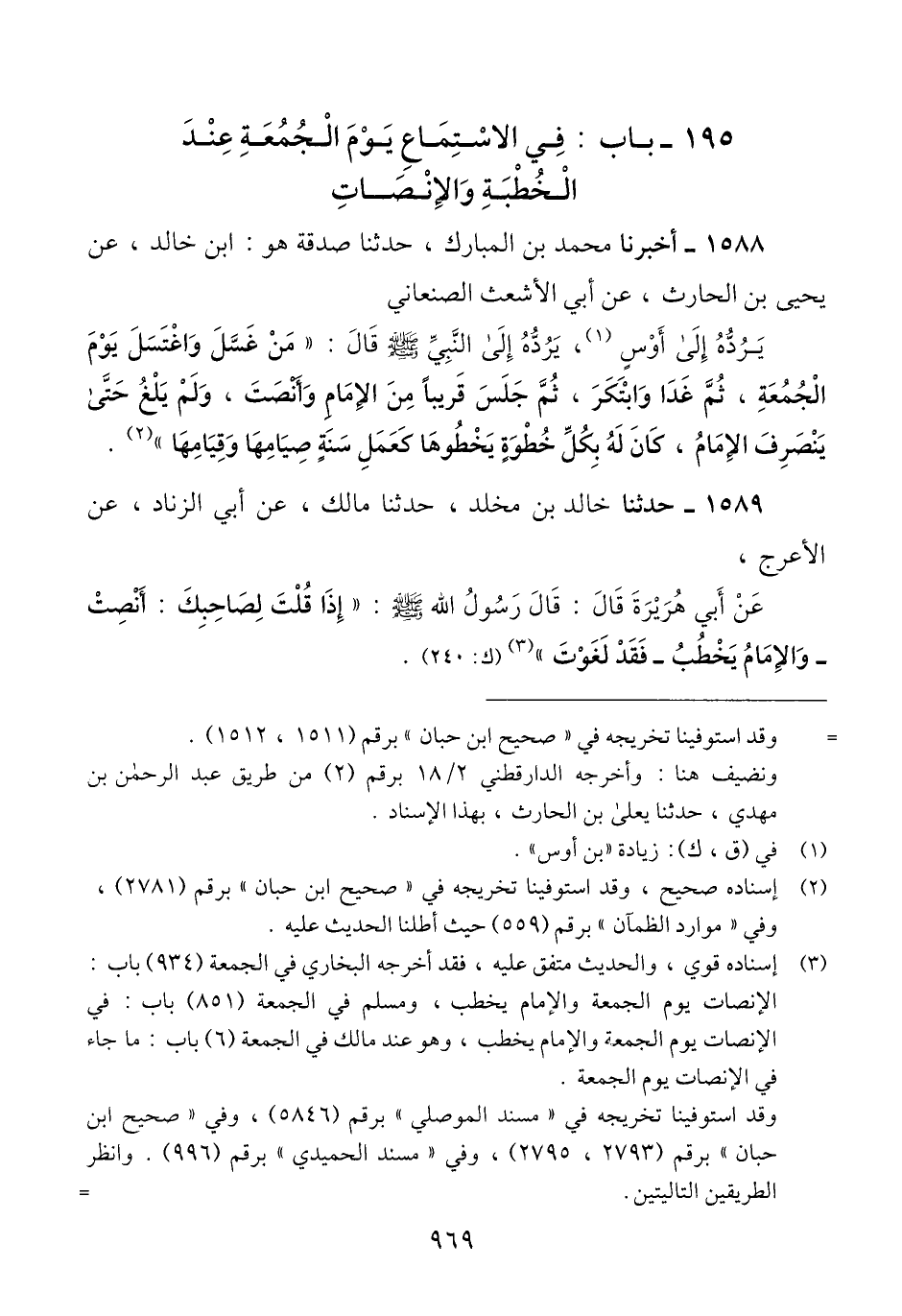 1588 - أَخْبَرَنَا مُحَمَّدُ بْنُ الْمُبَارَكِ، حَدَّثَنَا صَدَقَةُ هُوَ ابْنُ خَالِدٍ، عَنْ يَحْيَى بْنِ الْحَارِثِ، عَنْ أَبِي الْأَشْعَثِ الصَّنْعَانِيِّ، يَرُدُّهُ إِلَى أَوْسِ بْنِ أَوْسٍ، يَرُدُّهُ إِلَى النَّبِيِّ صَلَّى اللهُ عَلَيْهِ وَسَلَّمَ قَالَ: «§مَنْ غَسَّلَ وَاغْتَسَلَ يَوْمَ الْجُمُعَةِ، ثُمَّ غَدَا وَابْتَكَرَ، ثُمَّ جَلَسَ قَرِيبًا مِنَ الْإِمَامِ وَأَنْصَتَ، وَلَمْ يَلْغُ حَتَّى يَنْصَرِفَ الْإِمَامُ، كَانَ لَهُ بِكُلِّ خُطْوَةٍ يَخْطُوهَا كَعَمَلِ سَنَةٍ صِيَامِهَا وَقِيَامِهَا» Qإسناده صحيح