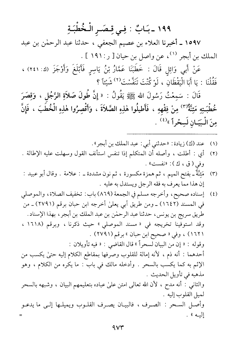 1597 - أَخْبَرَنَا الْعَلَاءُ بْنُ عُصَيْمٍ الْجُعْفِيُّ، حَدَّثَنَا عَبْدُ الرَّحْمَنِ بْنُ عَبْدِ الْمَلِكِ بْنِ أَبْجَرَ، حَدَّثَنِي أَبِي عَبْدُ الْمَلِكِ بْنُ أَبْجَرَ، عَنْ وَاصِلِ بْنِ حَيَّانَ، عَنْ أَبِي وَائِلٍ قَالَ: خَطَبَنَا عَمَّارُ بْنُ يَاسِرٍ، فَأَبْلَغَ وَأَوْجَزَ، فَقُلْنَا: يَا أَبَا الْيَقْظَانِ، لَوْ كُنْتَ تنَفَّسْتَ شَيْئًا؟ قَالَ: سَمِعْتُ رَسُولَ اللَّهِ صَلَّى اللهُ عَلَيْهِ وَسَلَّمَ يَقُولُ: «§إِنَّ طُولَ صَلَاةِ الرَّجُلِ، وَقِصَرَ خُطْبَتِهِ مَئِنَّةٌ مِنْ فِقْهِهِ، فَأَطِيلُوا هَذِهِ الصَّلَاةَ، وَاقْصُرُوا هَذِهِ الْخُطَبَ، فَإِنَّ مِنَ الْبَيَانِ لسِحْرًا» Qإسناده صحيح