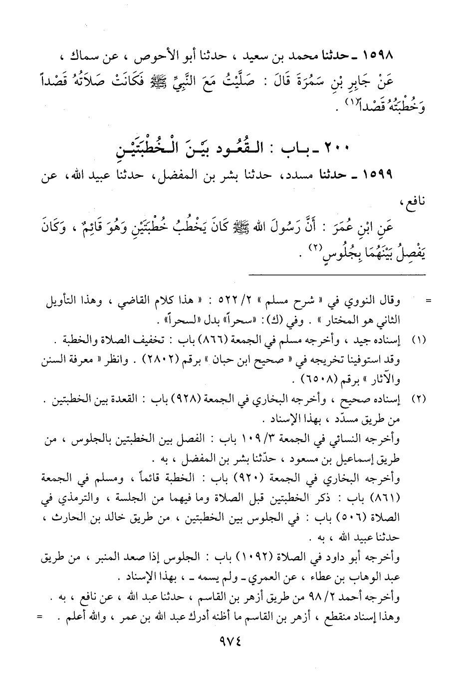 1599 - حَدَّثَنَا مُسَدَّدٌ، حَدَّثَنَا بِشْرُ بْنُ الْمُفَضَّلِ، حَدَّثَنَا عُبَيْدُ اللَّهِ، عَنْ نَافِعٍ، عَنْ ابْنِ عُمَرَ، «أَنَّ رَسُولَ اللَّهِ صَلَّى اللهُ عَلَيْهِ وَسَلَّمَ كَانَ §يَخْطُبُ خُطْبَتَيْنِ وَهُوَ قَائِمٌ، وَكَانَ يَفْصِلُ بَيْنَهُمَا بِجُلُوسٍ» Qإسناده صحيح