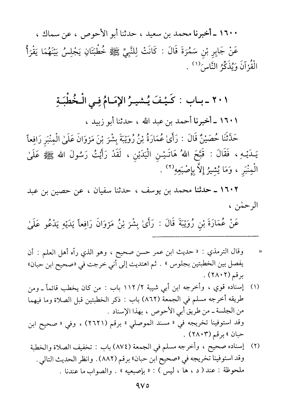 1601 - أَخْبَرَنَا أَحْمَدُ بْنُ عَبْدِ اللَّهِ، حَدَّثَنَا أَبُو زُبَيْدٍ، حَدَّثَنَا حُصَيْنٌ قَالَ: رَأَى عُمَارَةُ بْنُ رُوَيْبَةَ بِشْرَ بْنَ مَرْوَانَ، عَلَى الْمِنْبَرِ رَافِعًا يَدَيْهِ، فَقَالَ: «قَبَّحَ اللَّهُ هَاتَيْنِ الْيَدَيْنِ، لَقَدْ رَأَيْتُ رَسُولَ اللَّهِ صَلَّى اللهُ عَلَيْهِ وَسَلَّمَ عَلَى الْمِنْبَرِ، §وَمَا يُشِيرُ إِلَّا بِإُصْبُعِهِ» Qإسناده صحيح