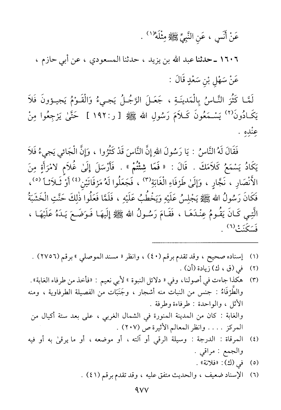 1606 - حَدَّثَنَا عَبْدُ اللَّهِ بْنُ يَزِيدَ، حَدَّثَنَا الْمَسْعُودِيُّ، عَنْ أَبِي حَازِمٍ، عَنْ سَهْلِ بْنِ سَعْدٍ قَالَ: لَمَّا كَثُرَ النَّاسُ بِالْمَدِينَةِ، جَعَلَ الرَّجُلُ يَجِيءُ وَالْقَوْمُ يَجِيئُونَ، فَلَا يَكَادُونَ ْ يَسْمَعُون كَلَامَ رَسُولِ اللَّهِ صَلَّى اللهُ عَلَيْهِ وَسَلَّمَ حَتَّى يَرْجِعُوا مِنْ عِنْدِهِ، فَقَالَ لَهُ النَّاسُ: يَا رَسُولَ اللَّهِ، إِنَّ النَّاسَ قَدْ كَثُرُوا، وَإِنَّ الْجَائِيَ يَجِيءُ، فَلَا يَكَادُ يَسْمَعُ كَلَامَكَ، قَالَ: «§فَمَا شِئْتُمْ»، فَأَرْسِلْ إِلَى غُلَامٍ لِامْرَأَةٍ مِنَ الْأَنْصَارِ، نَجَّارٍ، وَإِلَى طَرْفَاءِ الْغَابَةِ، فَجَعَلُوا لَهُ مِرْقَاتَيْنِ - أَوْ ثَلَاثًا -، فَكَانَ رَسُولُ اللَّهِ صَلَّى اللهُ عَلَيْهِ وَسَلَّمَ يَجْلِسُ عَلَيْهِ وَيَخْطُبُ عَلَيْهِ، فَلَمَّا فَعَلُوا ذَلِكَ حَنَّتِ الْخَشَبَةُ الَّتِي كَانَ يَقُومُ عِنْدَهَا، فَقَامَ رَسُولُ اللَّهِ صَلَّى اللهُ عَلَيْهِ وَسَلَّمَ إِلَيْهَا، فَوَضَعَ يَدَهُ عَلَيْهَا فَسَكَنَتْ "Qالإسناد ضعيف والحديث متفق عليه